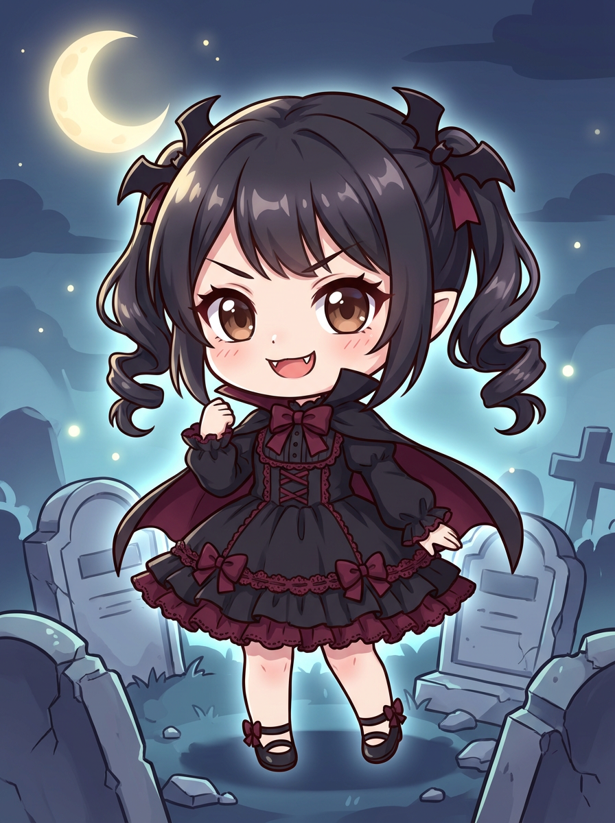 The model as a chibi vampire with tiny fangs and a mischievous smile, wearing a gothic dress with lace and ribbons . The setting is a moonlit graveyard. The style is in cute chibi anime illustration.