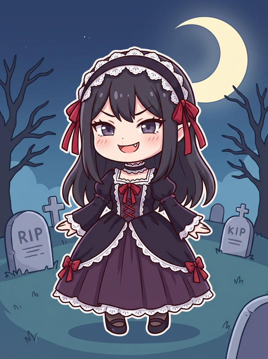 The model as a chibi vampire with tiny fangs and a mischievous smile, wearing a gothic dress with lace and ribbons . The setting is a moonlit graveyard. The style is in cute chibi anime illustration.