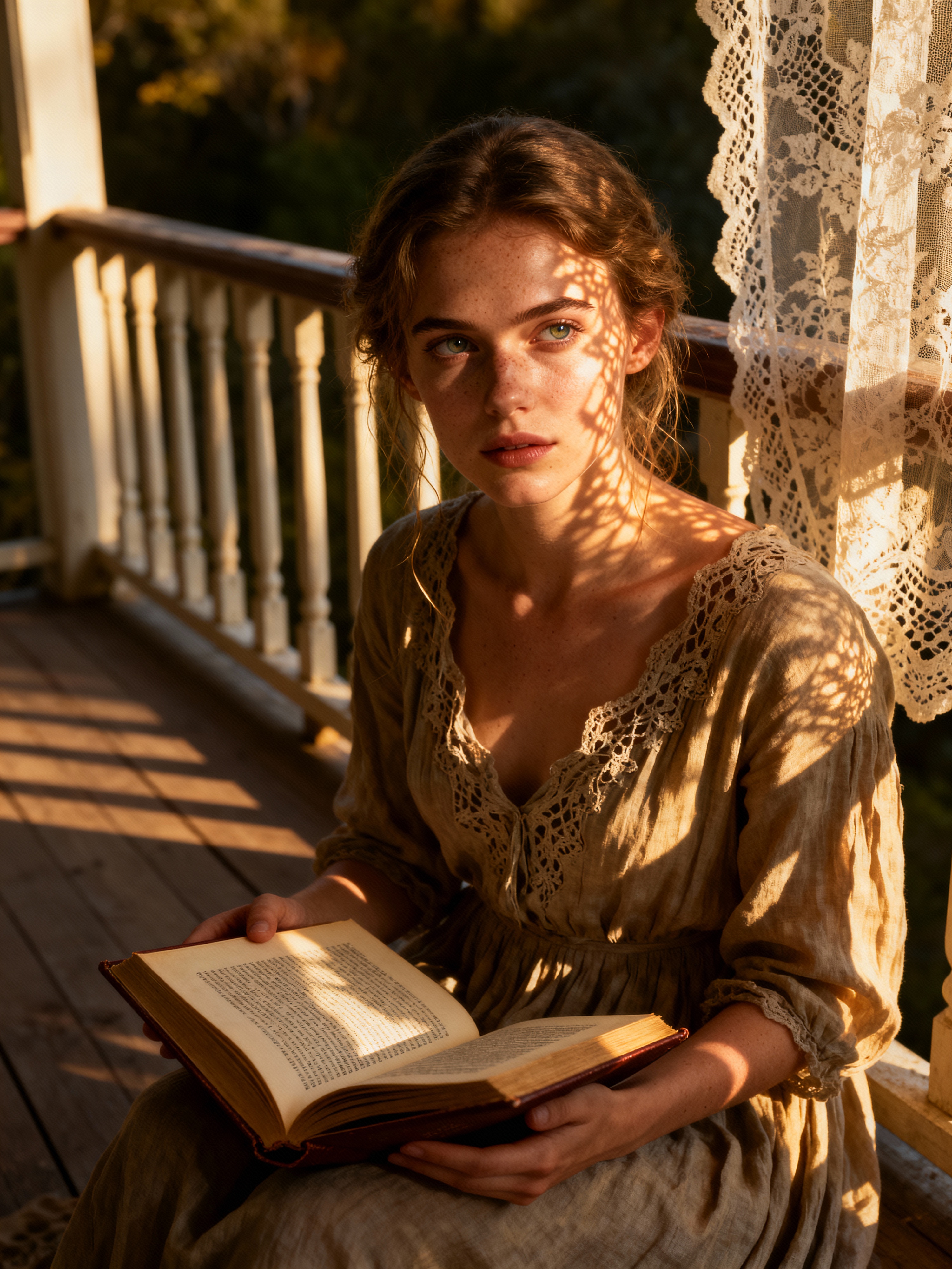 thoughtful feminine model reading a book on a sunny balcony or porch