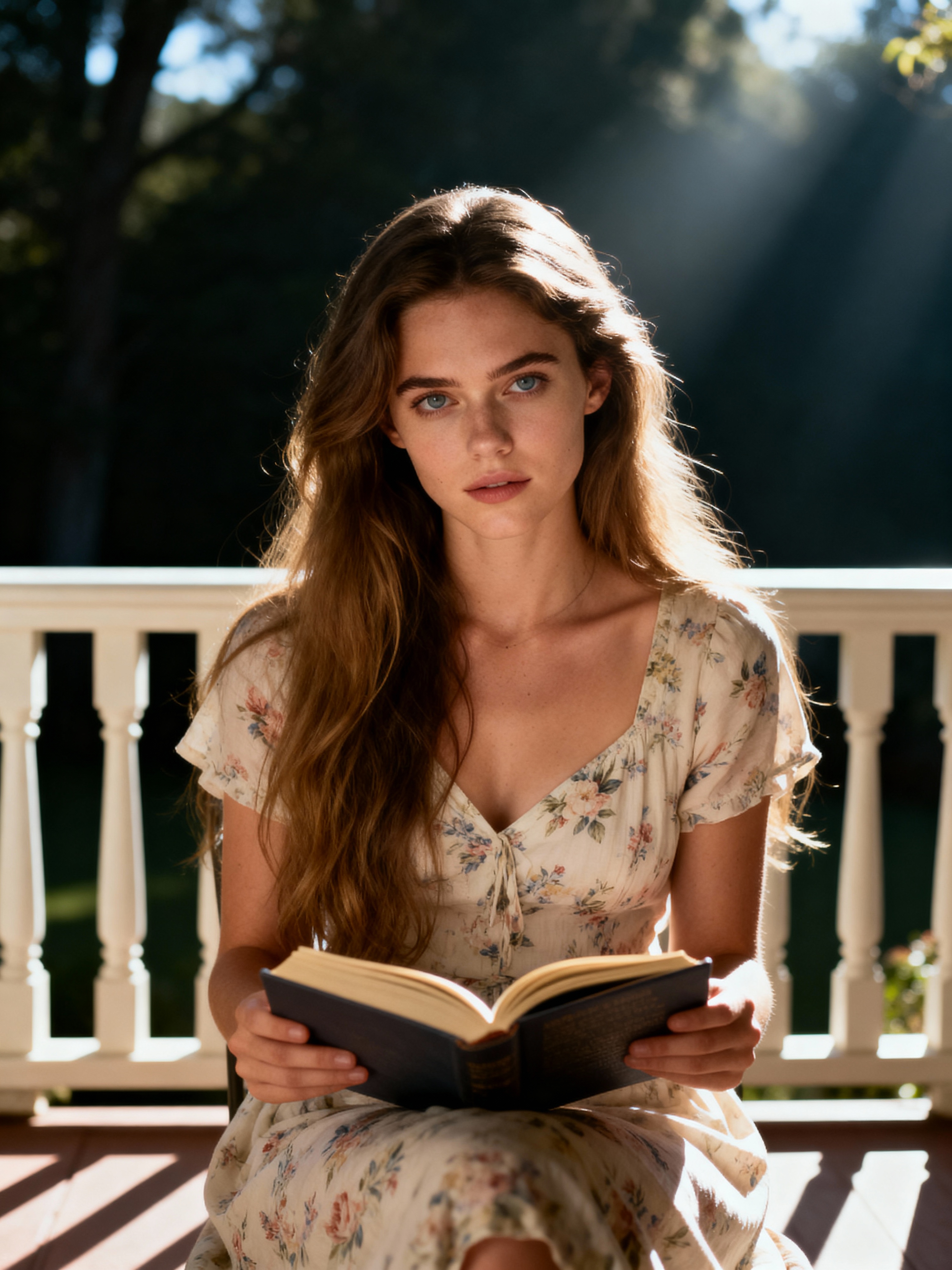 thoughtful feminine model reading a book on a sunny balcony or porch