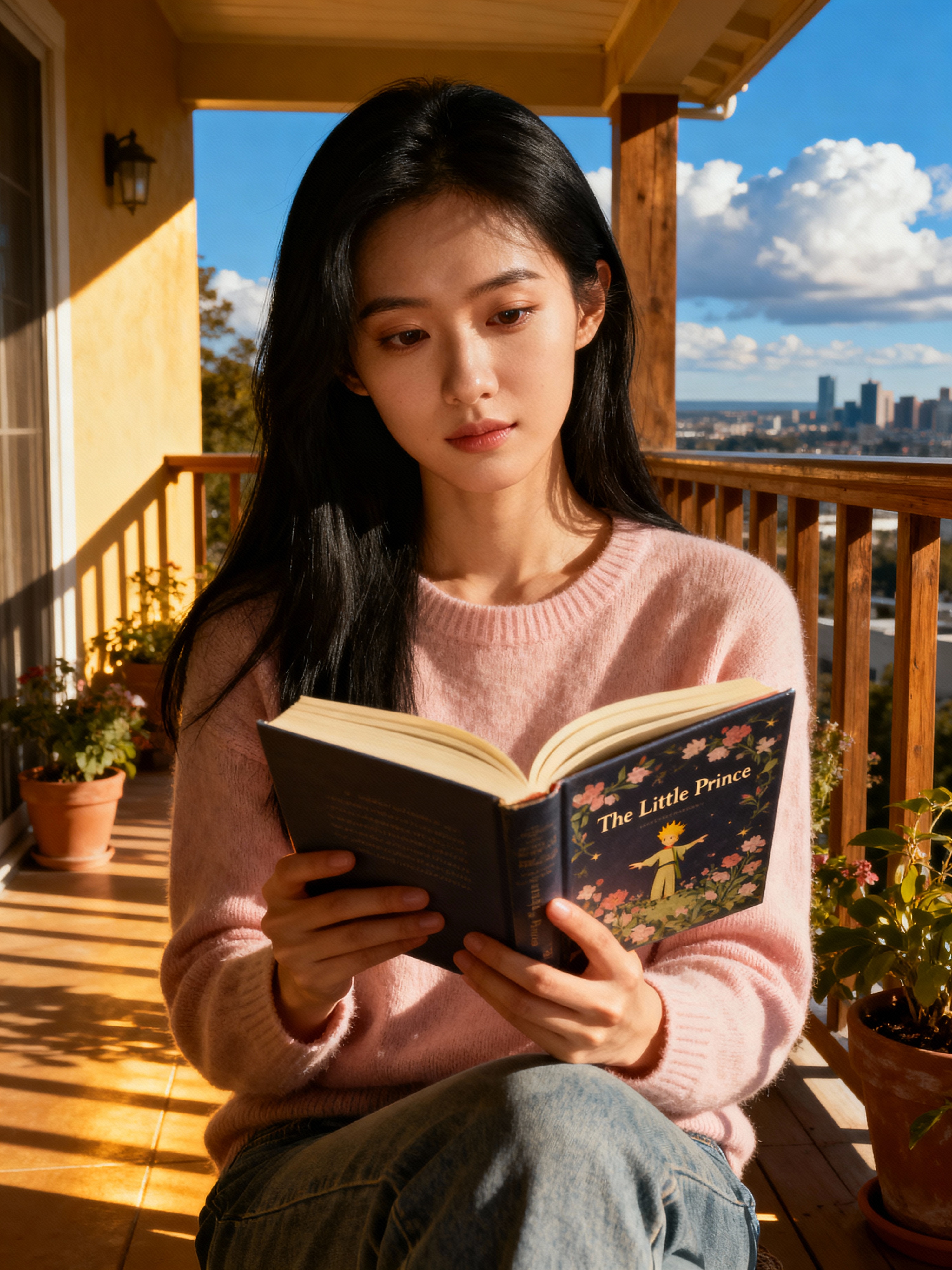 thoughtful feminine model reading a book on a sunny balcony or porch