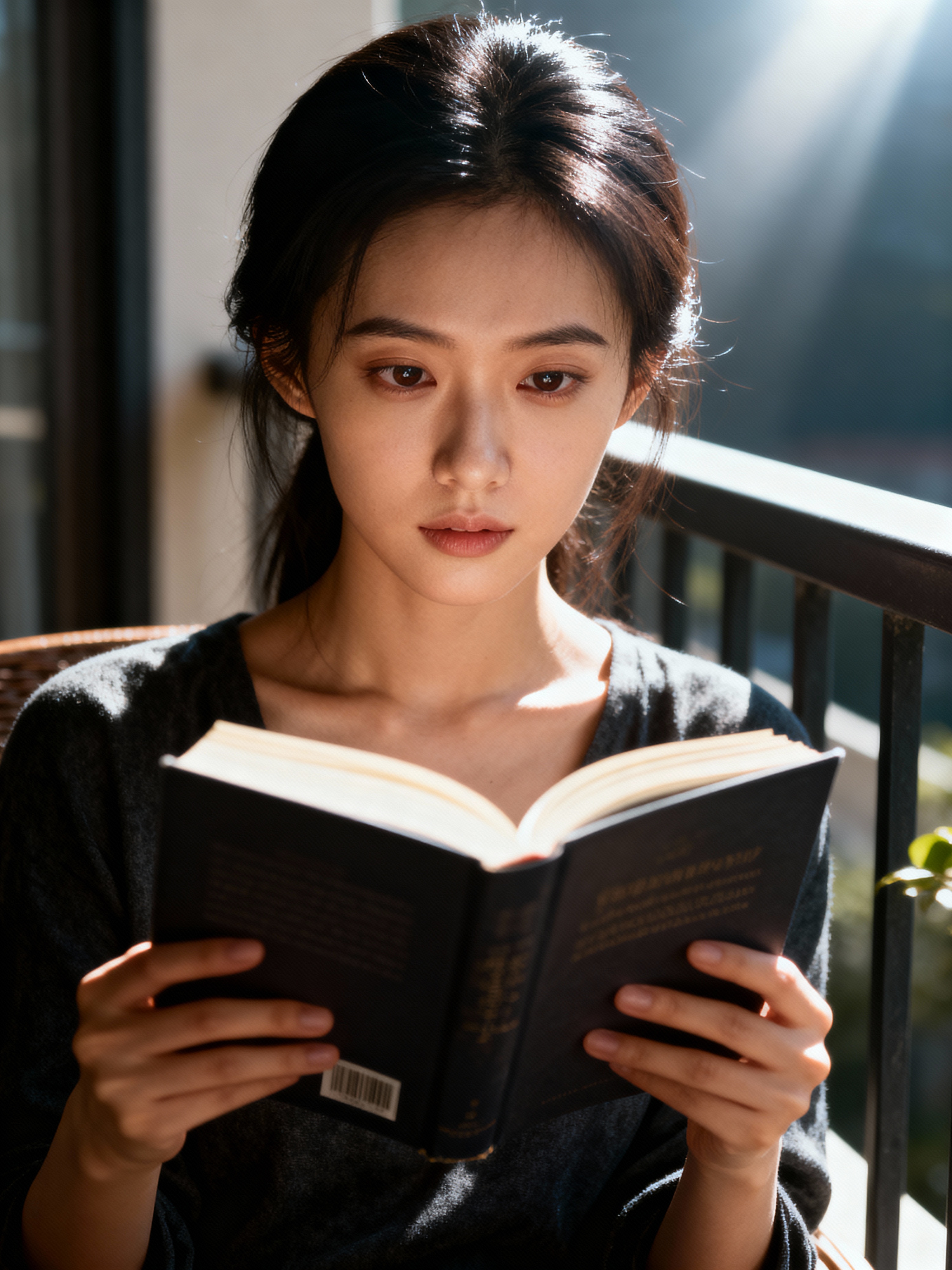 thoughtful feminine model reading a book on a sunny balcony or porch