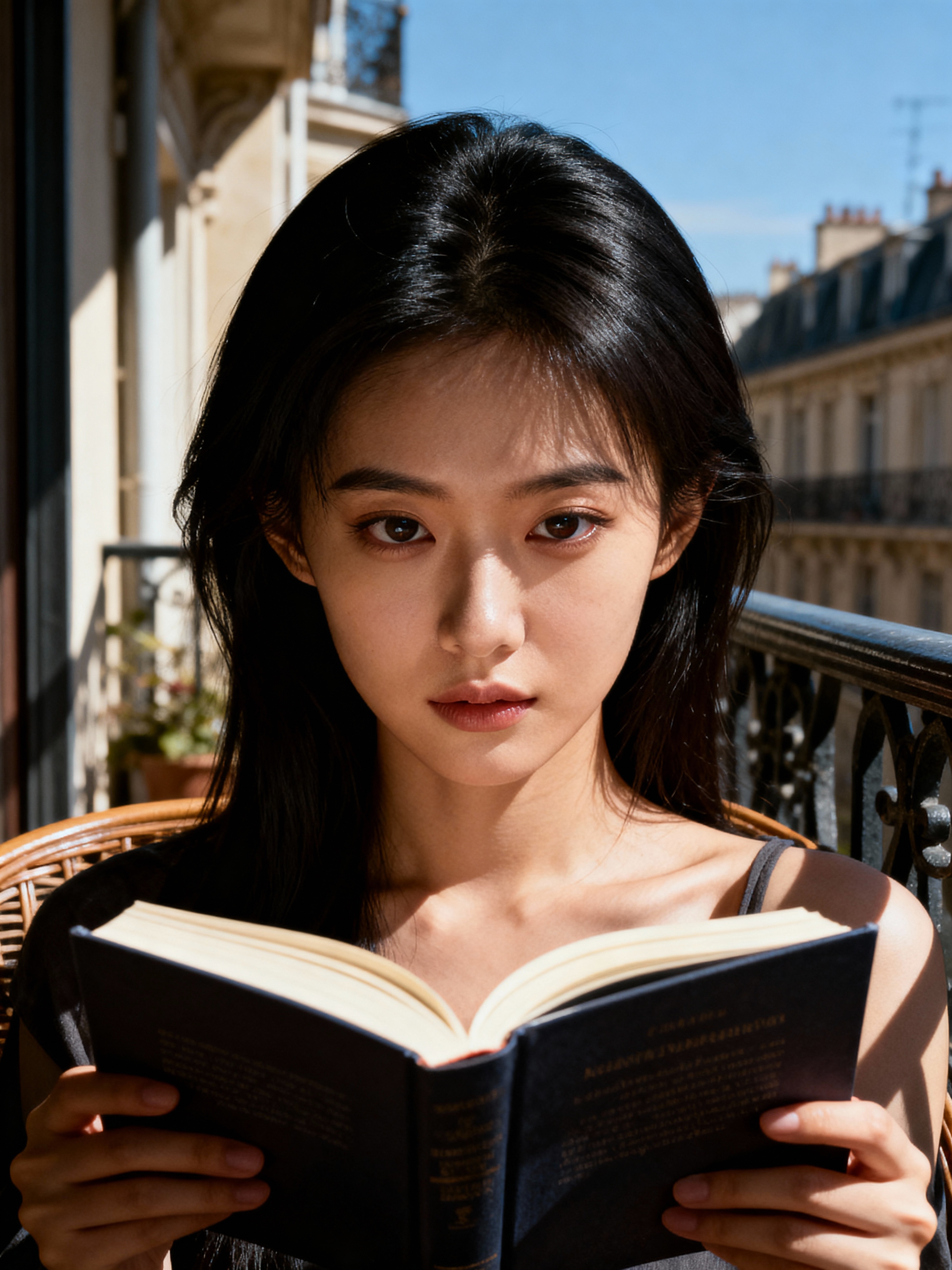 thoughtful feminine model reading a book on a sunny balcony or porch