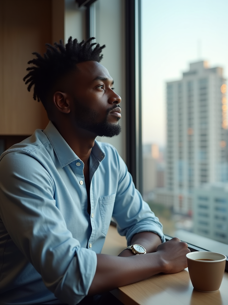 thoughtful model wearing premium casual shirt with sleeves rolled up with coffee, looking out office window, contemplative expression, city view