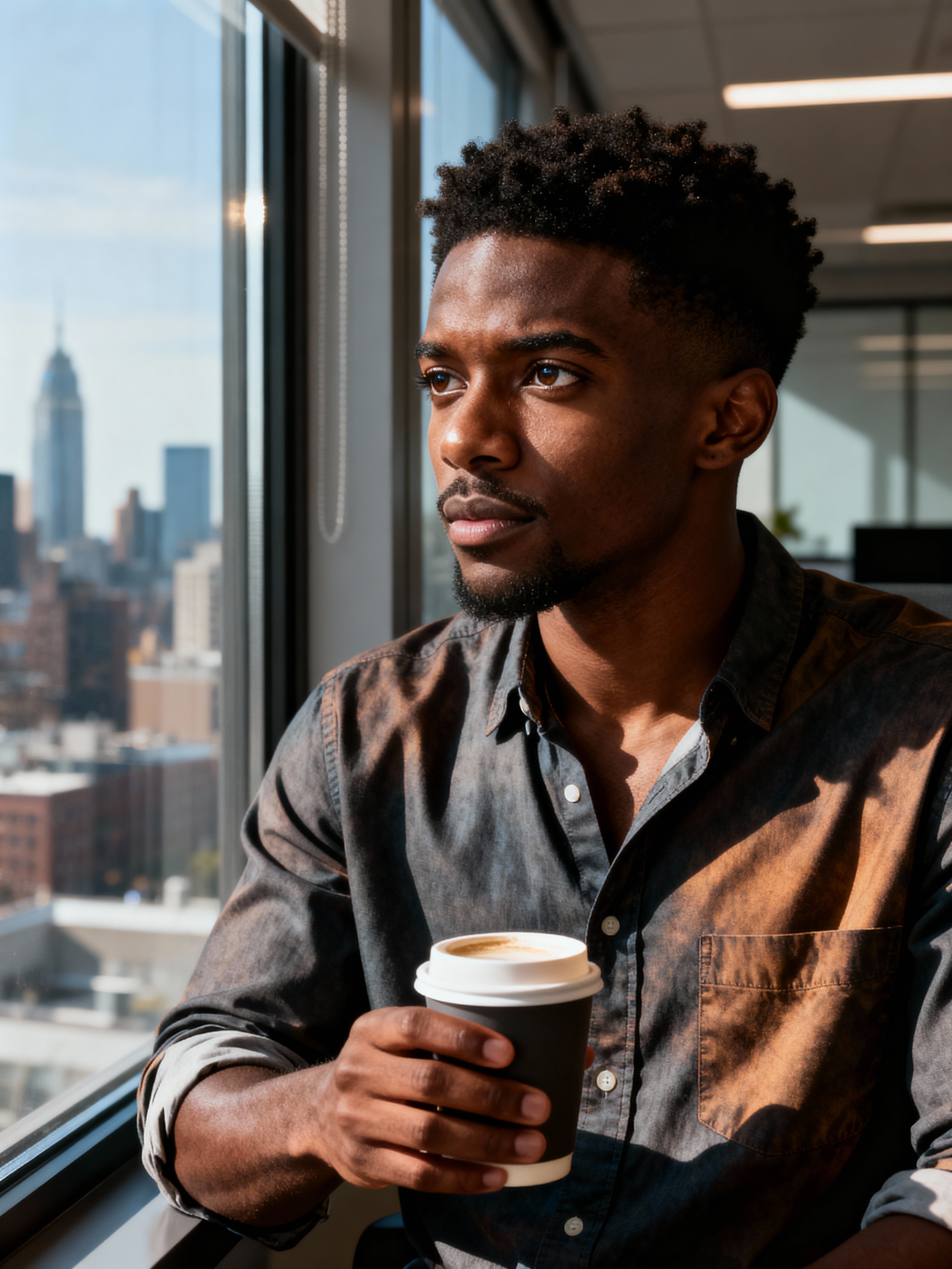thoughtful model wearing premium casual shirt with sleeves rolled up with coffee, looking out office window, contemplative expression, city view