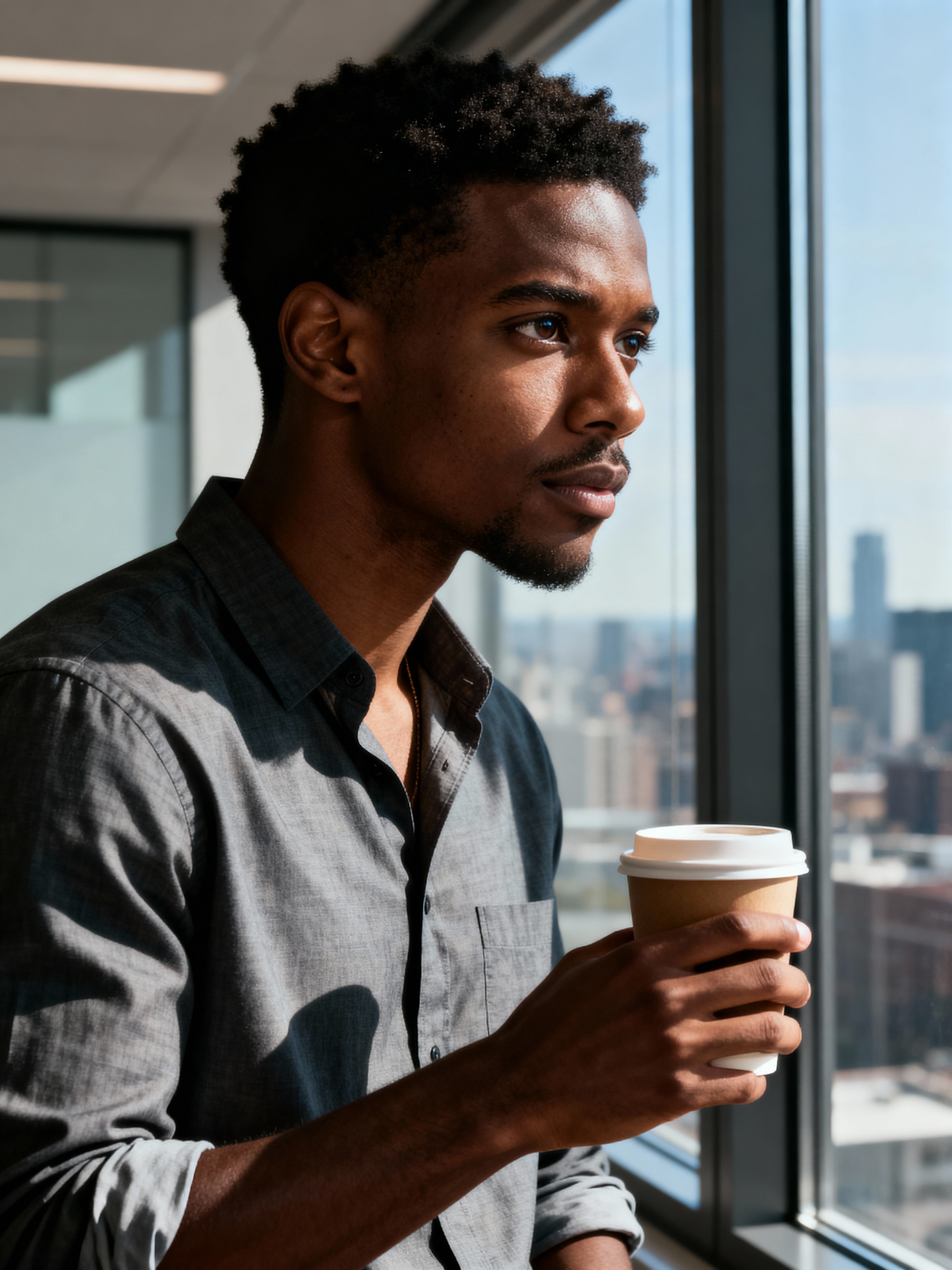 thoughtful model wearing premium casual shirt with sleeves rolled up with coffee, looking out office window, contemplative expression, city view