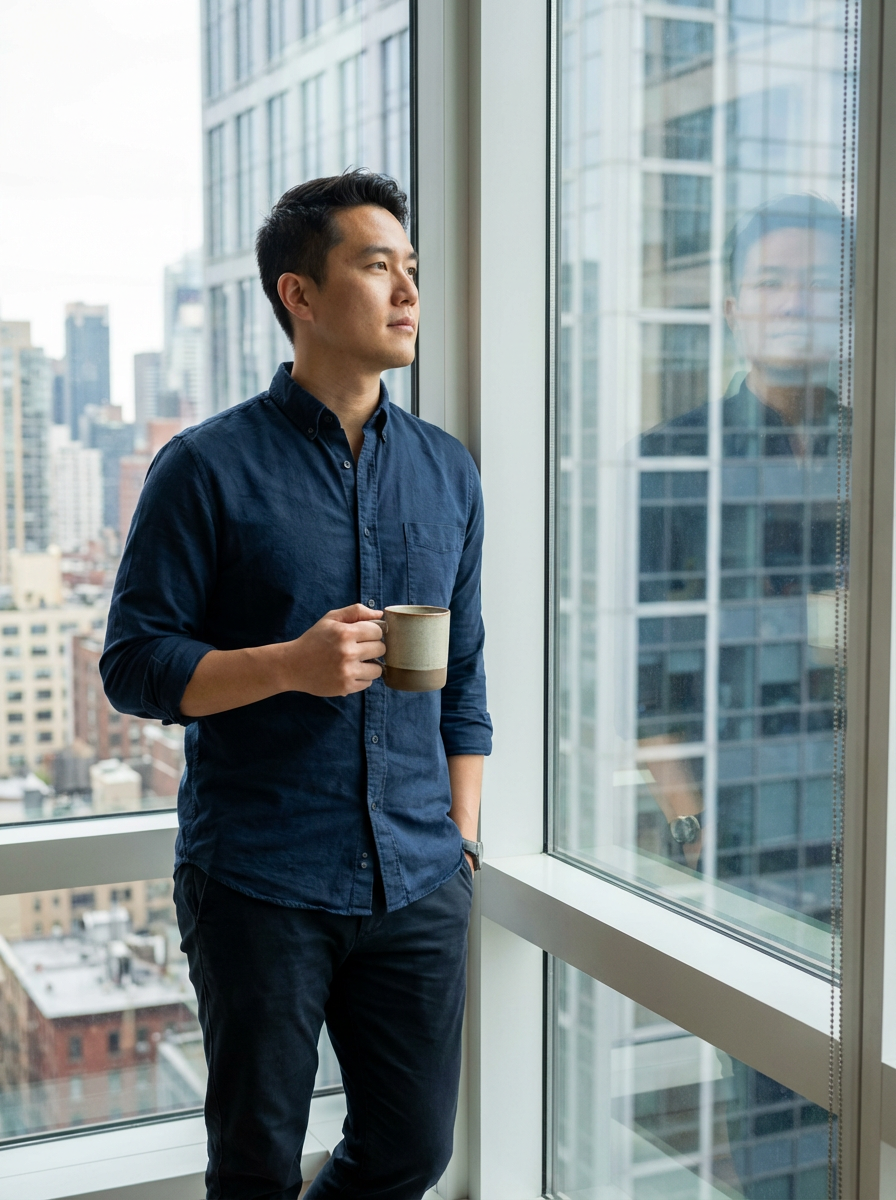thoughtful model wearing premium casual shirt with sleeves rolled up with coffee, looking out office window, contemplative expression, city view