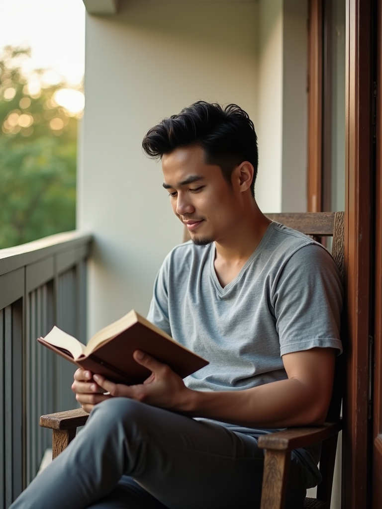 thoughtful masculine model reading a book on a sunny balcony or porch