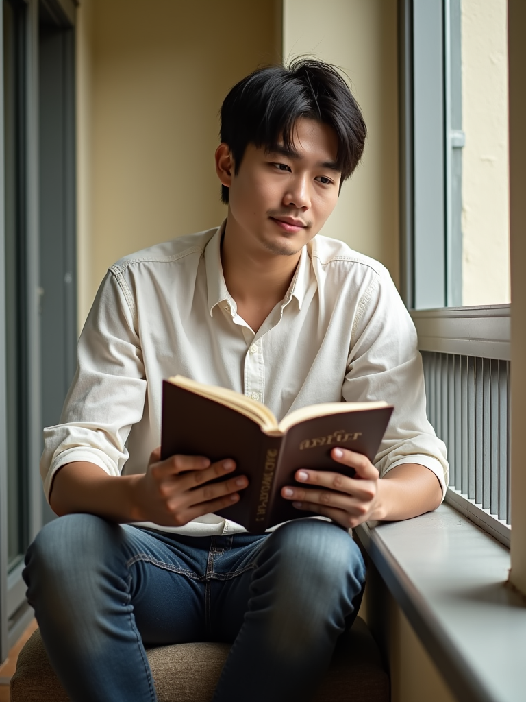 thoughtful masculine model reading a book on a sunny balcony or porch