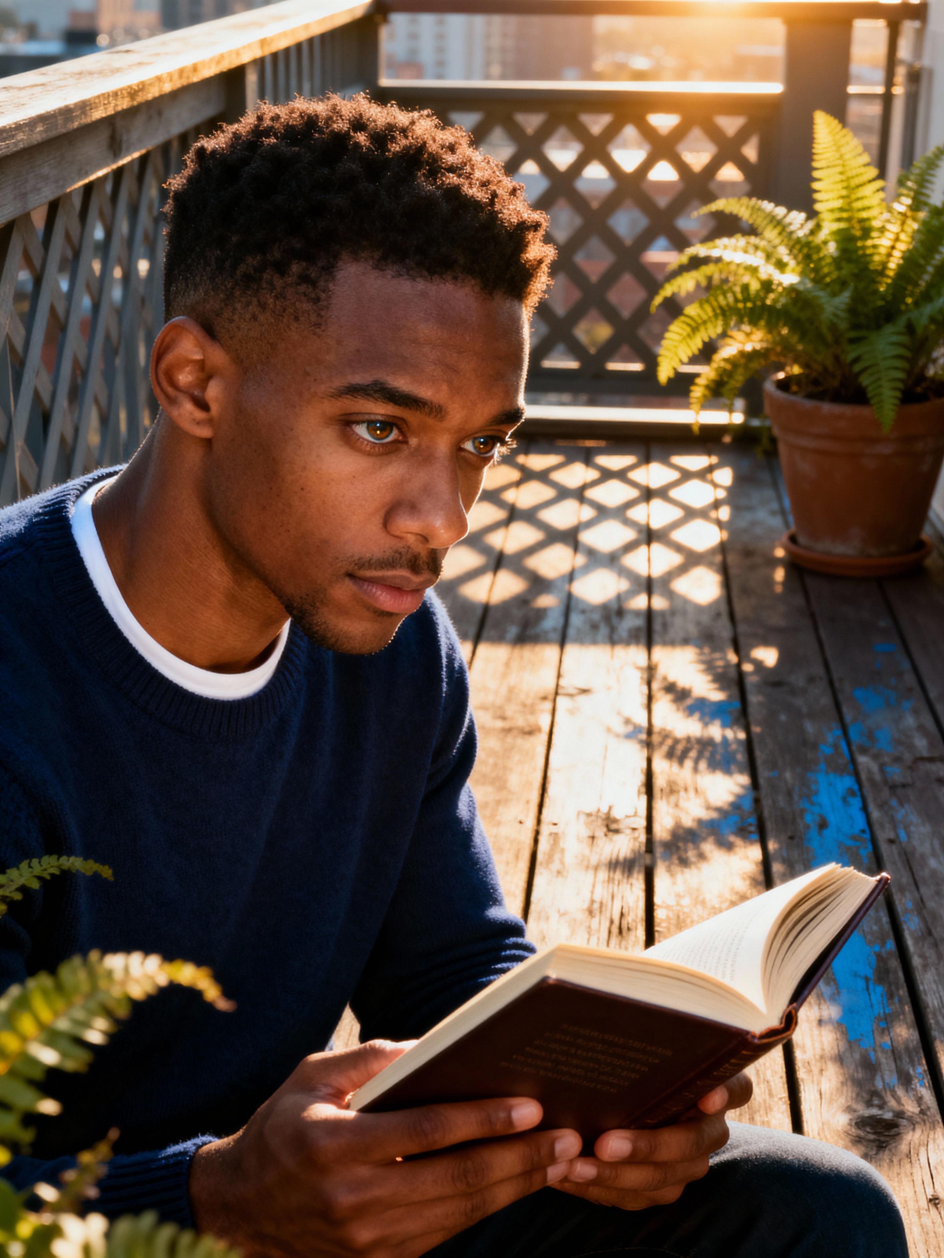 thoughtful masculine model reading a book on a sunny balcony or porch
