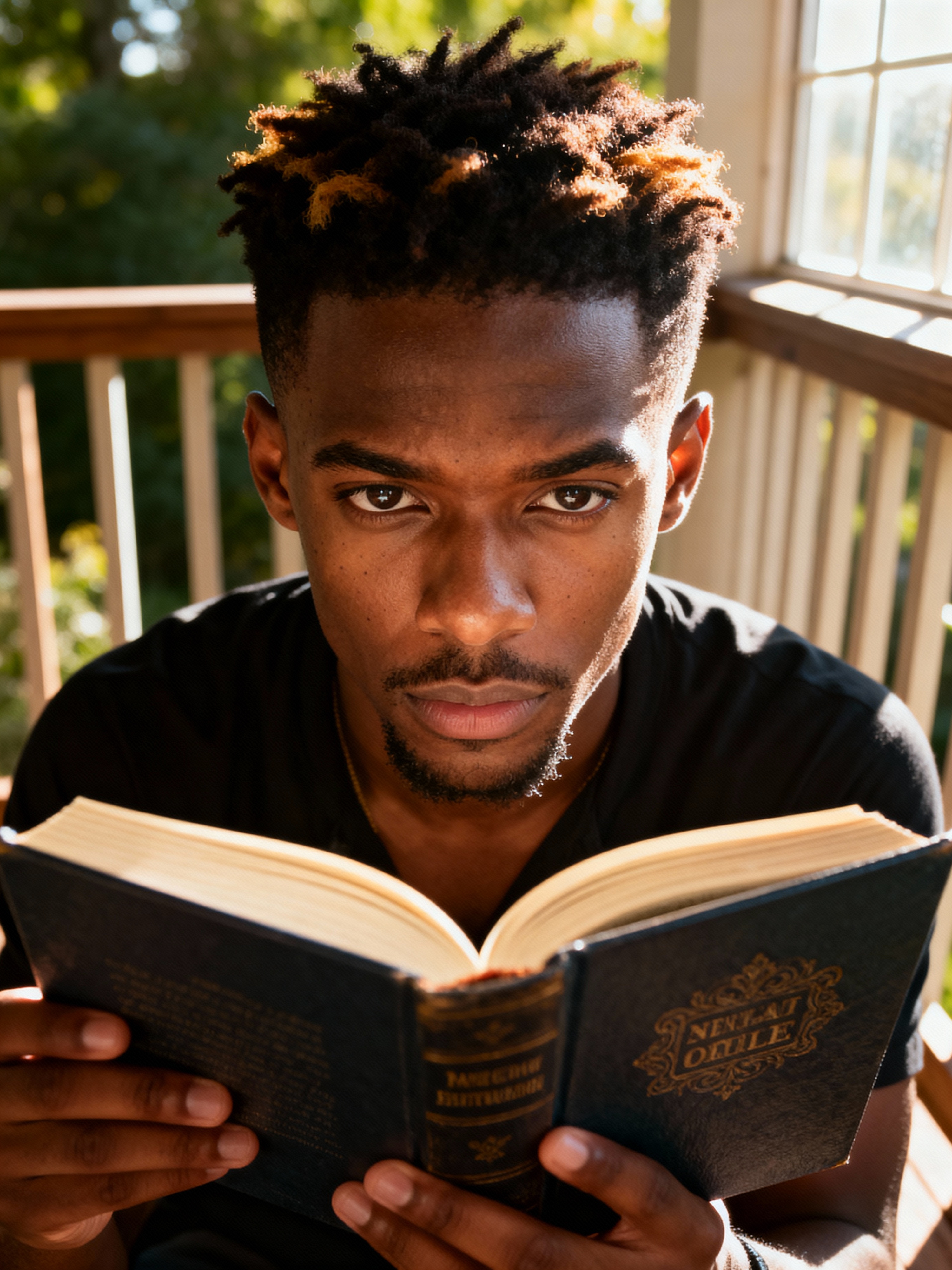 thoughtful masculine model reading a book on a sunny balcony or porch