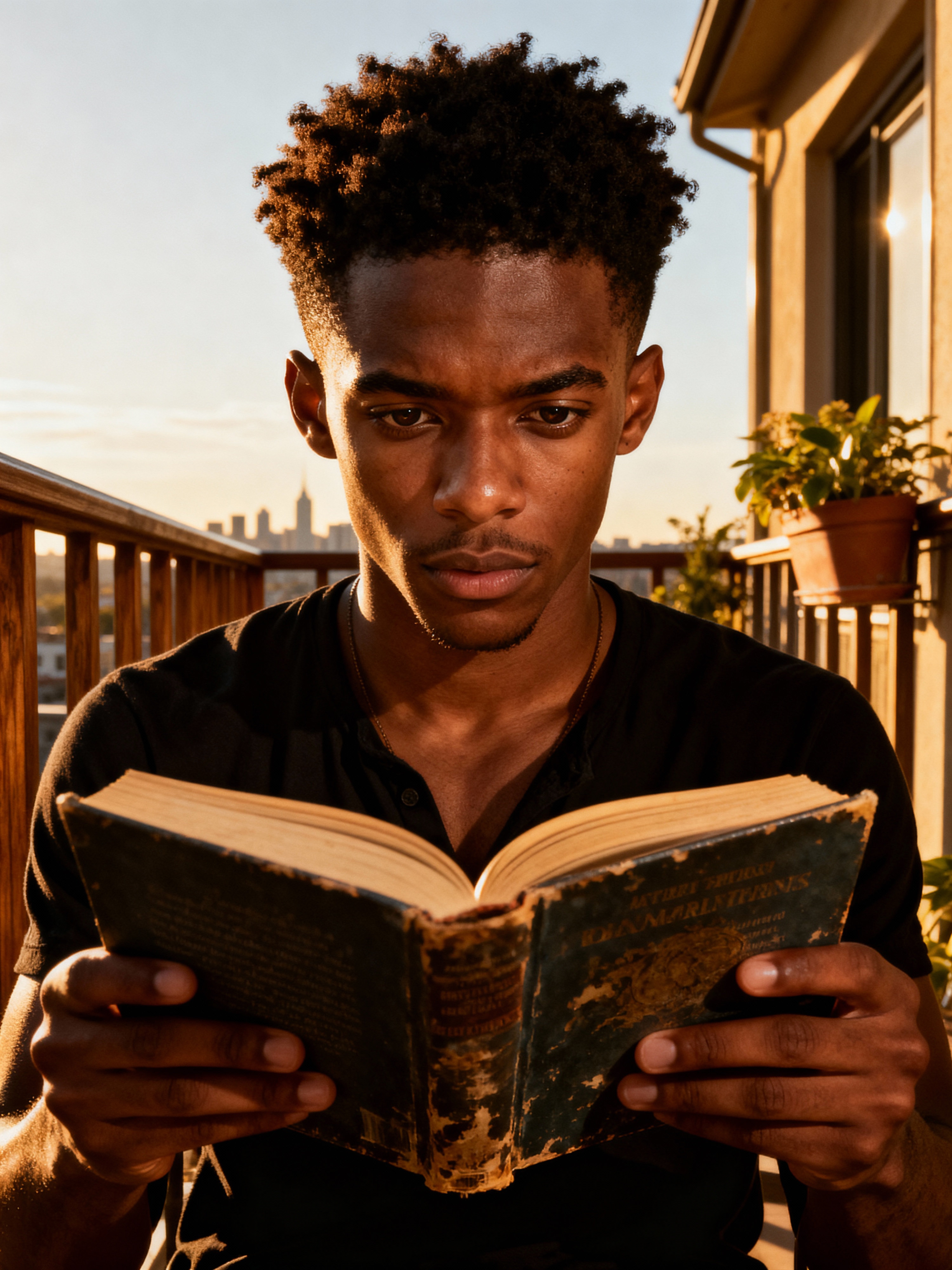 thoughtful masculine model reading a book on a sunny balcony or porch