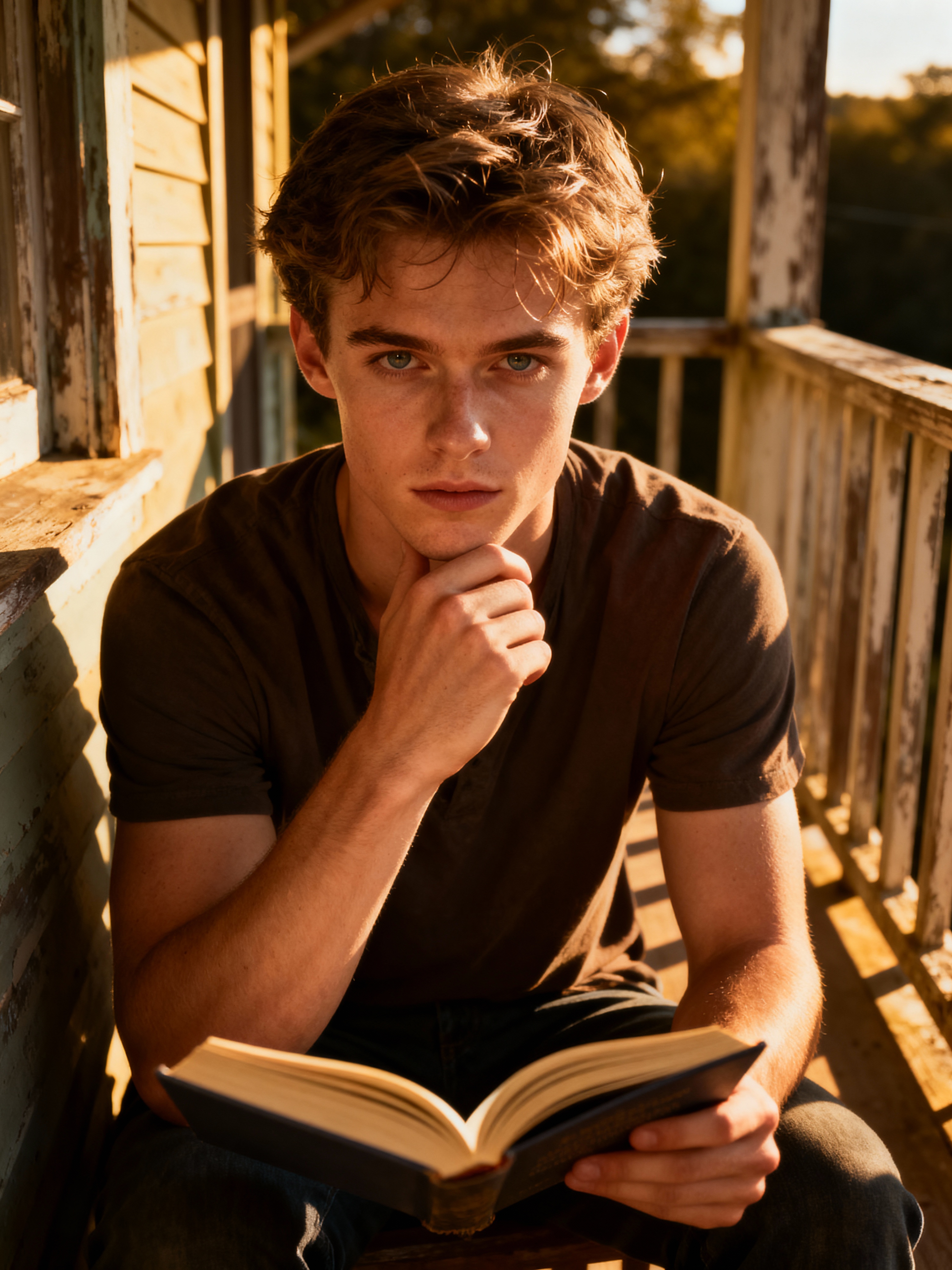 thoughtful masculine model reading a book on a sunny balcony or porch