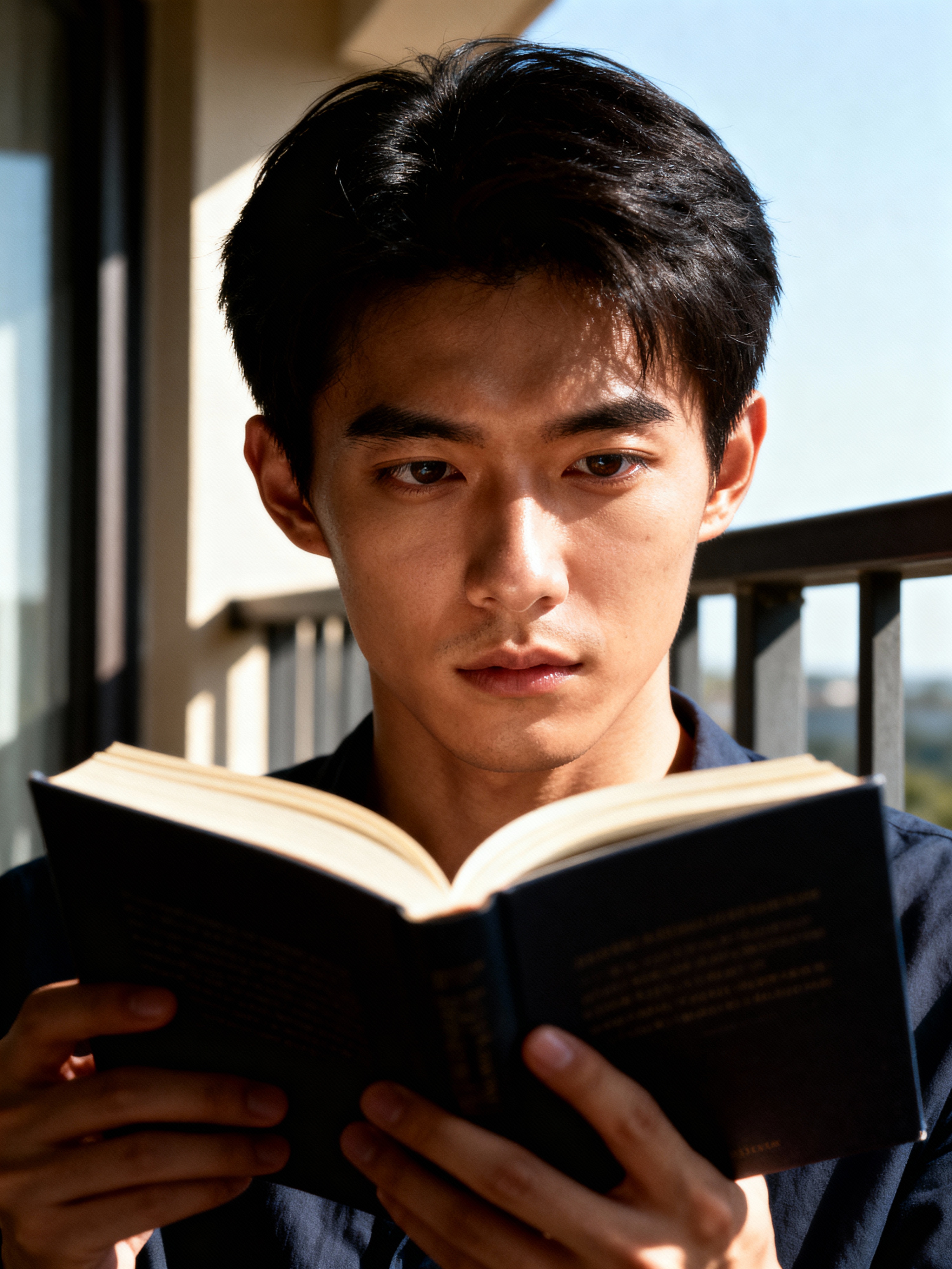 thoughtful masculine model reading a book on a sunny balcony or porch
