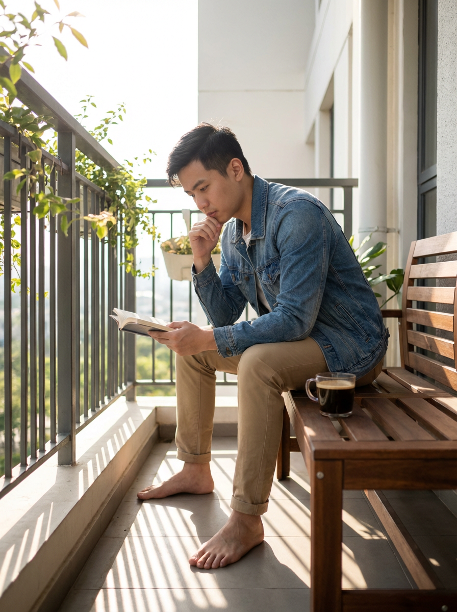 thoughtful masculine model reading a book on a sunny balcony or porch