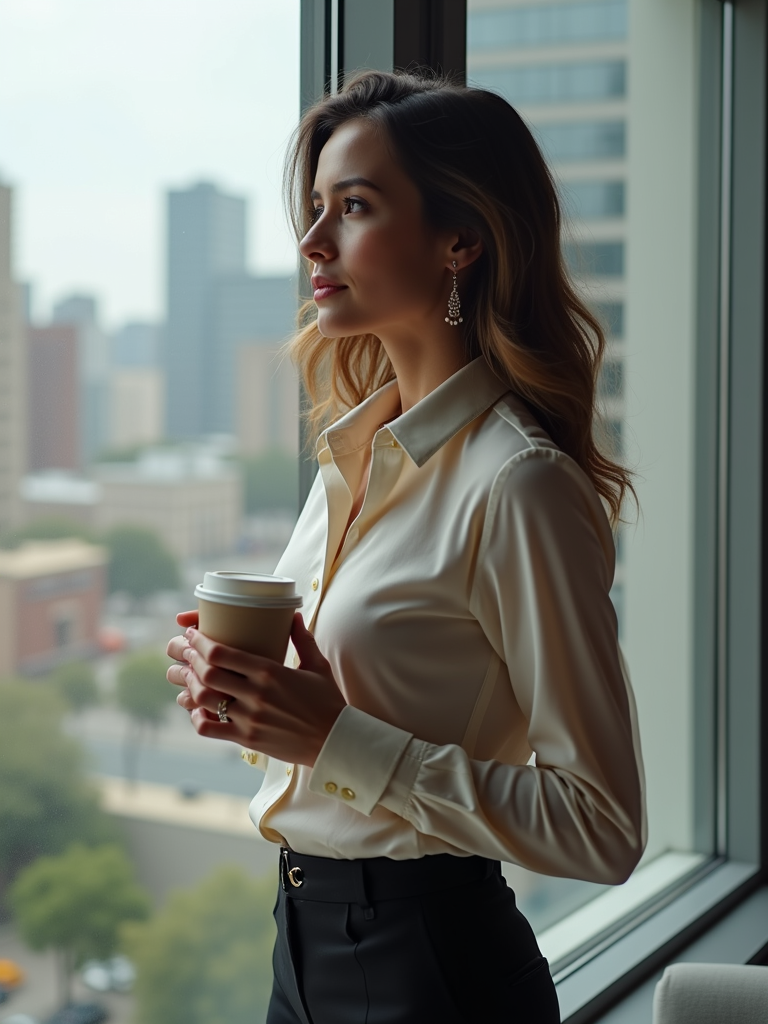 thoughtful model wearing elegant blouse with tailored pants with coffee, looking out office window, contemplative expression, city view