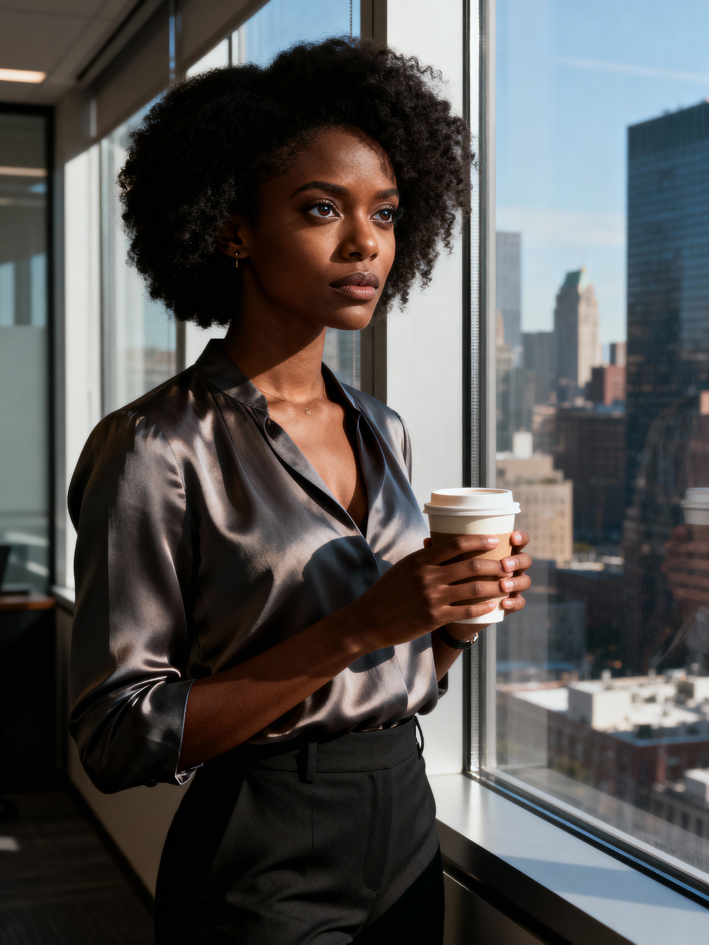 thoughtful model wearing elegant blouse with tailored pants with coffee, looking out office window, contemplative expression, city view