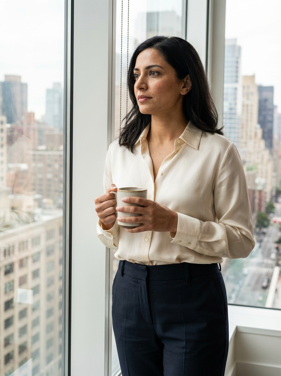 thoughtful model wearing elegant blouse with tailored pants with coffee, looking out office window, contemplative expression, city view