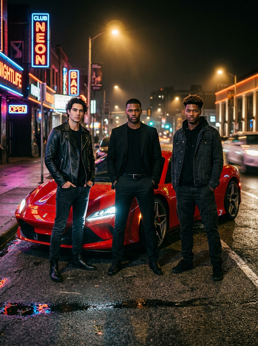Three confident male womans posing powerfully in front of a sleek red sports car on a neon-lit roadside at night, , hands in pockets, intense stares, volumetric streetlight glow and car headlights, dynamic wide-angle composition, vogue night editorial, seductive masculine energy.