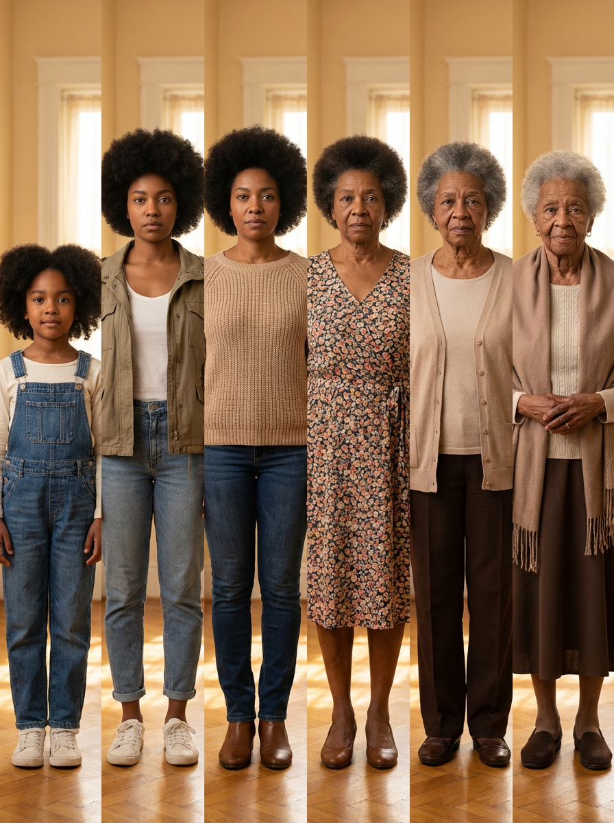 time-lapse style showing model aging from child to elderly, multiple ages in sequence, natural aging progression, life journey visualization