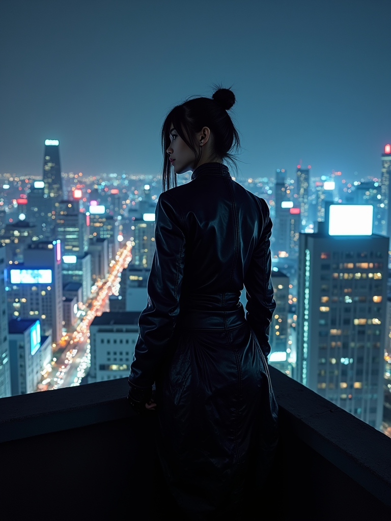 Tokyo rooftop photoshoot at night. Dark futuristic fashion, standing against neon skyline. Breathtaking cityscape photography.