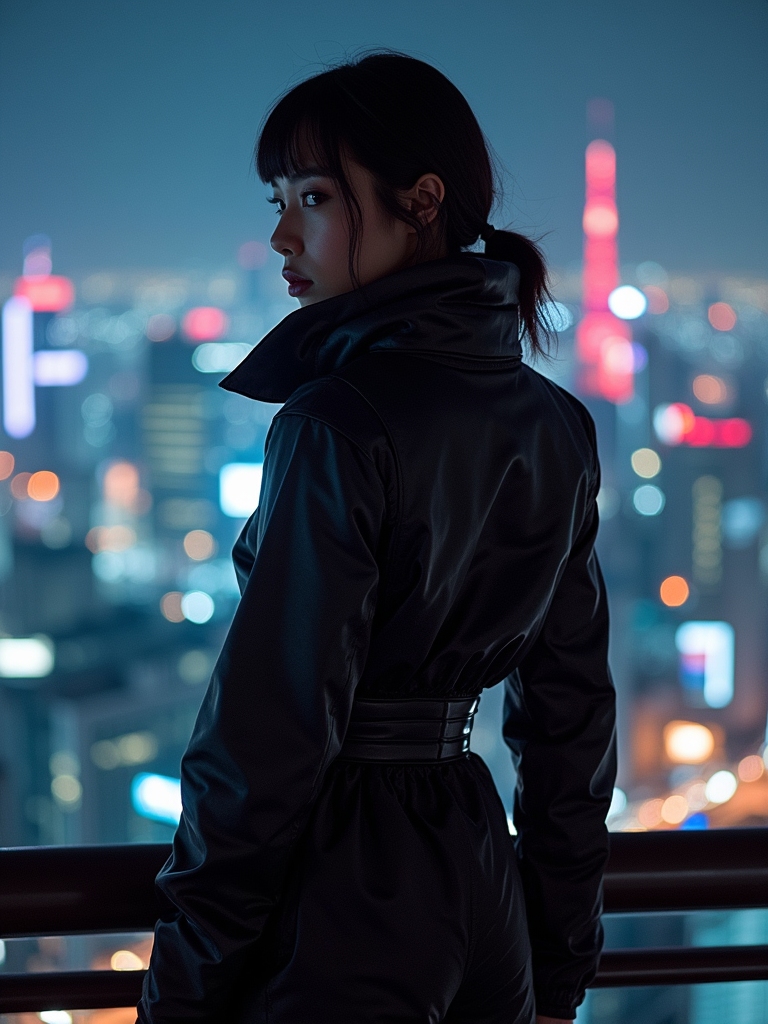 Tokyo rooftop photoshoot at night. Dark futuristic fashion, standing against neon skyline. Breathtaking cityscape photography.