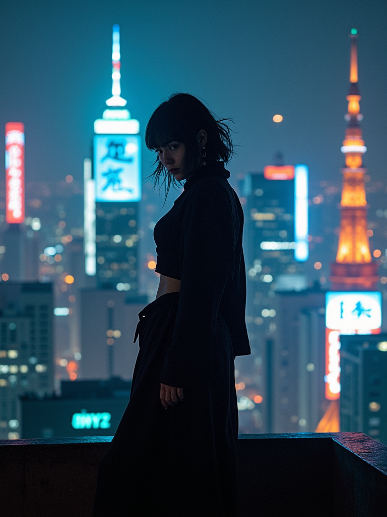 Tokyo rooftop photoshoot at night. Dark futuristic fashion, standing against neon skyline. Breathtaking cityscape photography.