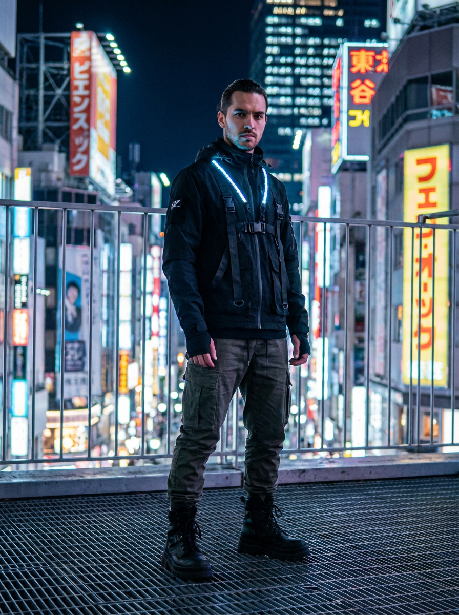 Tokyo rooftop photoshoot of model at night. Dark futuristic fashion, standing against neon skyline. Breathtaking cityscape photography.