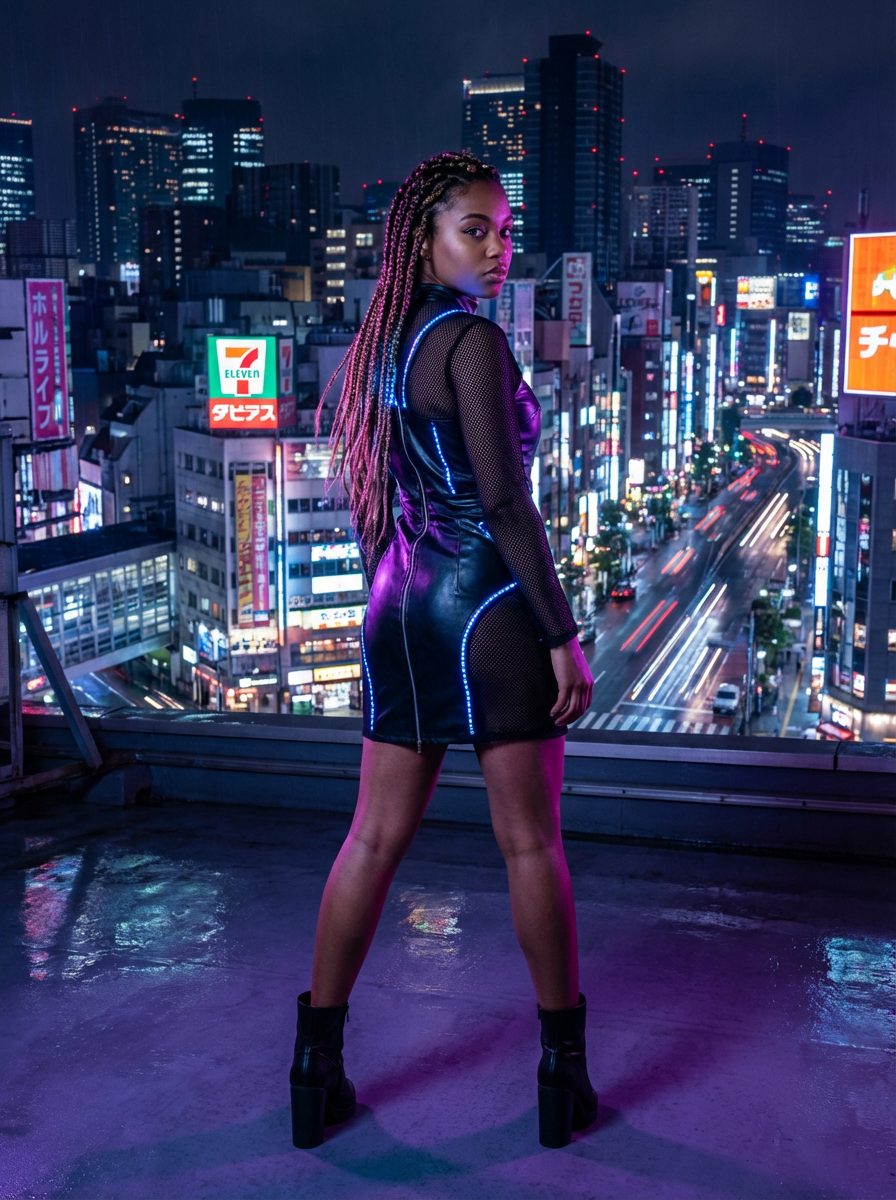 Tokyo rooftop photoshoot of model at night. Sleek cyberpunk dress, dramatic lighting . Breathtaking cityscape photography.
