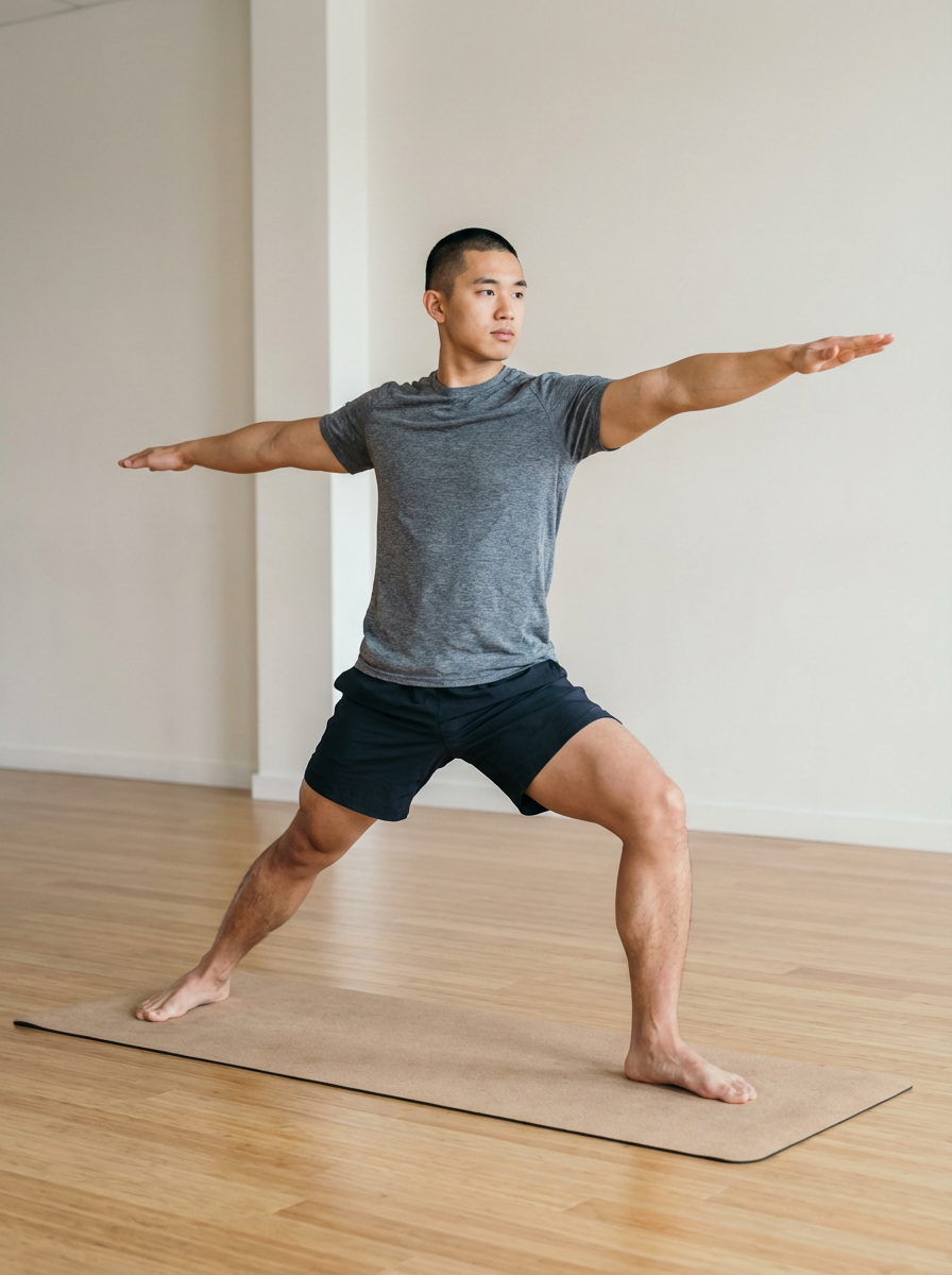 toned model doing yoga pose, athletic shorts, flexible fit body, studio setting