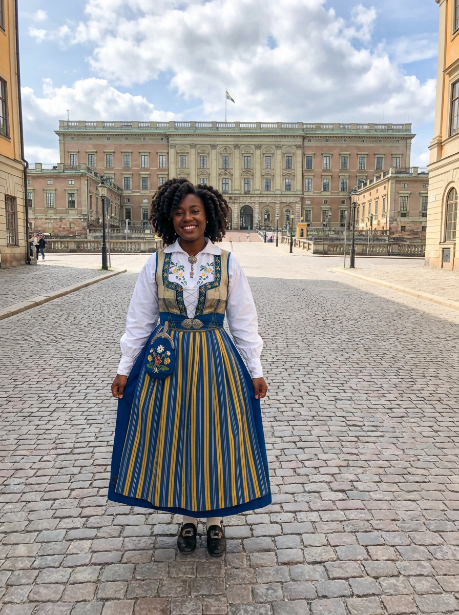 traditional model in Stockholm wearing a Swedish folkdräkt, Stockholm Palace in the background