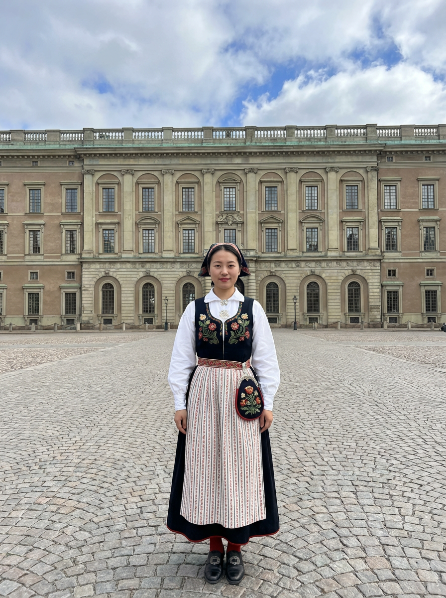 traditional model in Stockholm wearing a Swedish folkdräkt, Stockholm Palace in the background