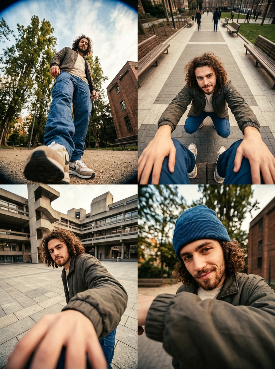 Transform the original photo into a dramatic, photorealistic, ultra-detailed set of 4 different styles, each a mid close up wide-angle shot with an extreme, dynamic camera angle (including more grid views from directly below or above), where one or more body parts are positioned right next to the lens and appear huge, the rest of the body recedes strongly in perspective, and the same person strikes a stylish, complex, powerful pose in a consistent, expanded version of the original environment, with cinematic lighting, high contrast, crisp textures, and precise color grading.
