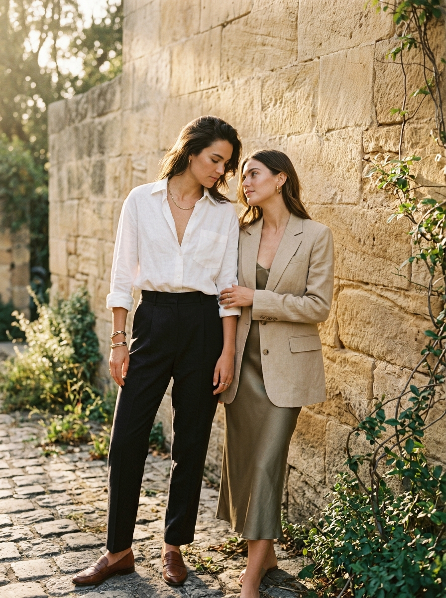Two glamorous mans standing close before textured stone wall, one in white linen shirt unbuttoned, golden hour outdoor light filtering through, tension, wide editorial angle, high-fashion romance.
