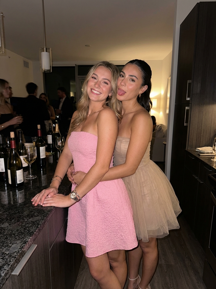 {"type": "image_generation", "aspect_ratio": "4:5", "quality": "ultra_realistic", "resolution": "8K", "style": ["photorealistic", "natural party vibe", "editorial realism"], "scene": {"location": "modern apartment kitchen at night", "environment": ["soft warm indoor lighting", "kitchen counter in foreground", "wine bottles and glasses in background", "clean modern interior"], "atmosphere": "fun, playful, casual house party mood"}, "subjects": [{"gender": "model", "pose": "leaning slightly forward on the kitchen counter", "expression": "big open smile, playful energy", "outfit": "strapless pink mini dress with textured fabric", "hair": "medium length hair, loose waves", "accessories": ["wristwatch", "bracelets"]}, {"gender": "model", "pose": "standing behind the first model, arms wrapped around her waist", "expression": "playful, tongue out, teasing smile", "outfit": "light beige strapless tulle dress with soft layers", "hair": "hair, sleek and straight, pulled back"}], "camera": {"device": "DSLR", "lens": "35mm", "angle": "eye-level", "focus": "sharp subjects, softly blurred background"}, "lighting": {"type": "warm ambient indoor lighting", "effect": "natural skin tones, soft shadows, realistic highlights"}, "details": {"skin_texture": "natural, realistic", "fabric_detail": "highly detailed, visible texture", "no_filters": true, "no_over_smoothing": true}}