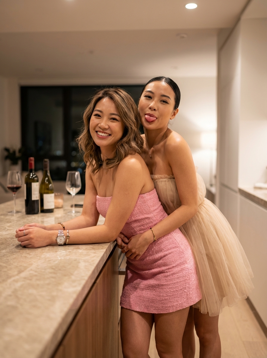 {"type": "image_generation", "aspect_ratio": "4:5", "quality": "ultra_realistic", "resolution": "8K", "style": ["photorealistic", "natural party vibe", "editorial realism"], "scene": {"location": "modern apartment kitchen at night", "environment": ["soft warm indoor lighting", "kitchen counter in foreground", "wine bottles and glasses in background", "clean modern interior"], "atmosphere": "fun, playful, casual house party mood"}, "subjects": [{"gender": "model", "pose": "leaning slightly forward on the kitchen counter", "expression": "big open smile, playful energy", "outfit": "strapless pink mini dress with textured fabric", "hair": "medium length hair, loose waves", "accessories": ["wristwatch", "bracelets"]}, {"gender": "model", "pose": "standing behind the first model, arms wrapped around her waist", "expression": "playful, tongue out, teasing smile", "outfit": "light beige strapless tulle dress with soft layers", "hair": "hair, sleek and straight, pulled back"}], "camera": {"device": "DSLR", "lens": "35mm", "angle": "eye-level", "focus": "sharp subjects, softly blurred background"}, "lighting": {"type": "warm ambient indoor lighting", "effect": "natural skin tones, soft shadows, realistic highlights"}, "details": {"skin_texture": "natural, realistic", "fabric_detail": "highly detailed, visible texture", "no_filters": true, "no_over_smoothing": true}}