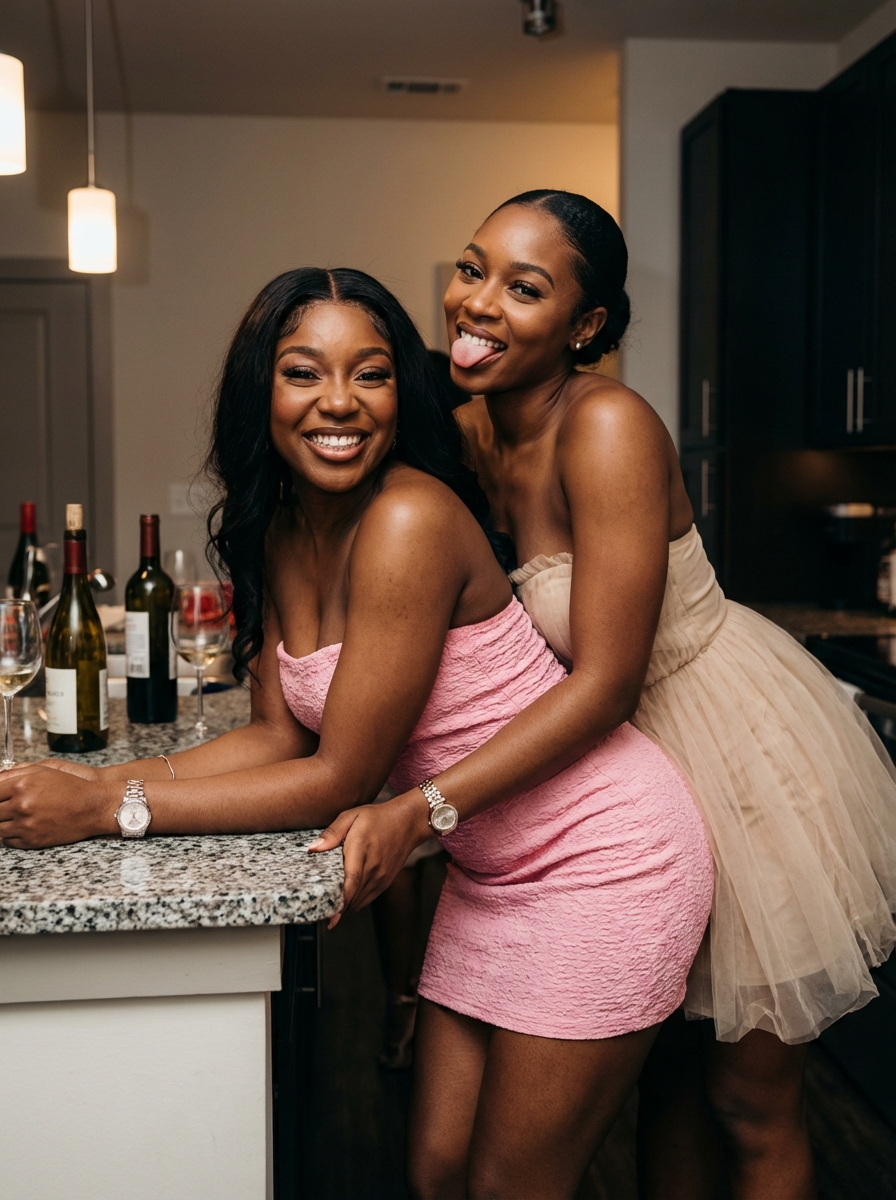 {"type": "image_generation", "aspect_ratio": "4:5", "quality": "ultra_realistic", "resolution": "8K", "style": ["photorealistic", "natural party vibe", "editorial realism"], "scene": {"location": "modern apartment kitchen at night", "environment": ["soft warm indoor lighting", "kitchen counter in foreground", "wine bottles and glasses in background", "clean modern interior"], "atmosphere": "fun, playful, casual house party mood"}, "subjects": [{"gender": "model", "pose": "leaning slightly forward on the kitchen counter", "expression": "big open smile, playful energy", "outfit": "strapless pink mini dress with textured fabric", "hair": "medium length hair, loose waves", "accessories": ["wristwatch", "bracelets"]}, {"gender": "model", "pose": "standing behind the first model, arms wrapped around her waist", "expression": "playful, tongue out, teasing smile", "outfit": "light beige strapless tulle dress with soft layers", "hair": "hair, sleek and straight, pulled back"}], "camera": {"device": "DSLR", "lens": "35mm", "angle": "eye-level", "focus": "sharp subjects, softly blurred background"}, "lighting": {"type": "warm ambient indoor lighting", "effect": "natural skin tones, soft shadows, realistic highlights"}, "details": {"skin_texture": "natural, realistic", "fabric_detail": "highly detailed, visible texture", "no_filters": true, "no_over_smoothing": true}}