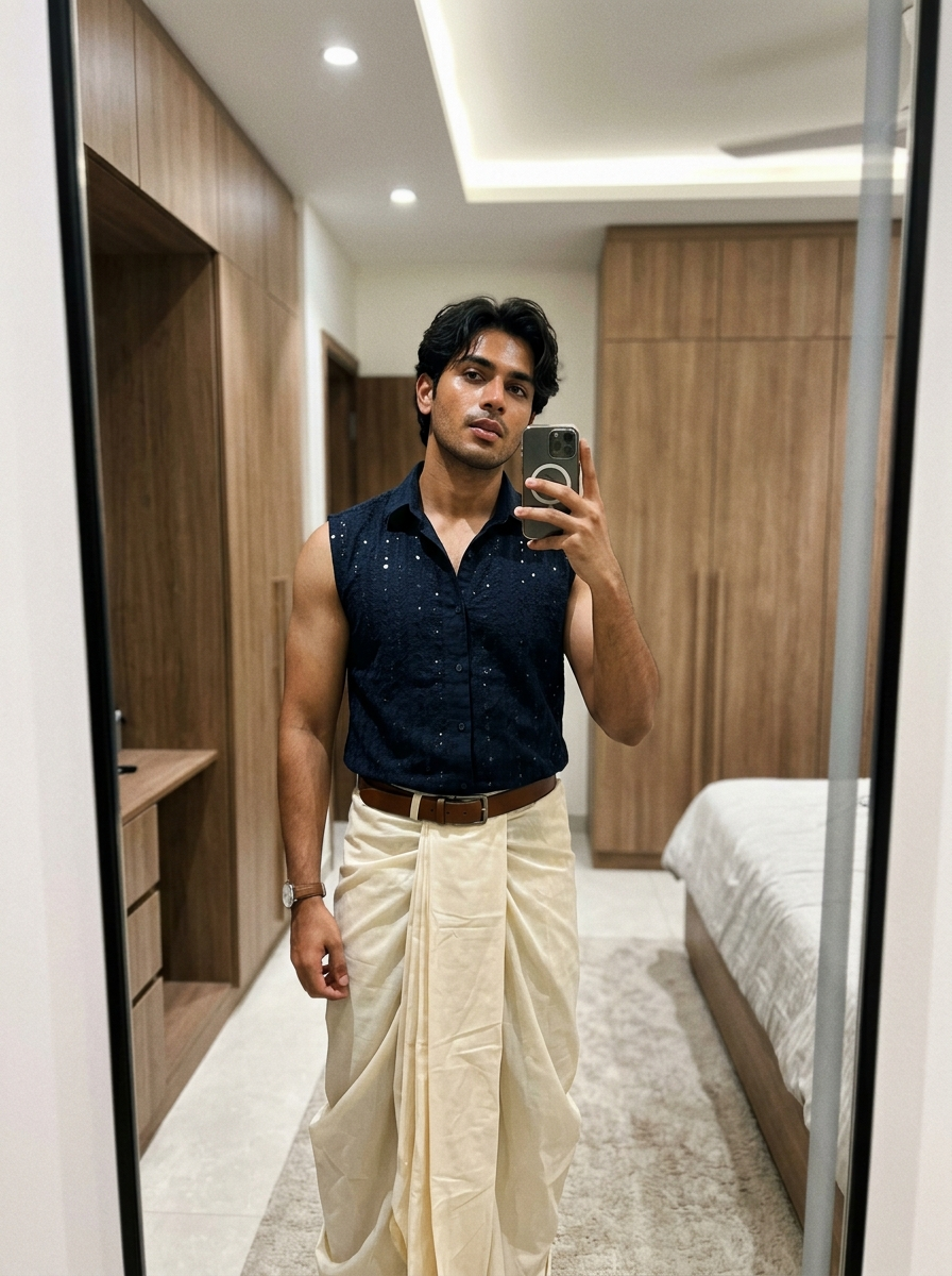 {"type": "image_generation", "man_style": "ultra_photorealistic", "aspect_ratio": "9:16", "resolution": "8K", "quality": "high_detail_realism", "identity_reference": {"use_reference_image": true, "face_preservation": "exact", "body_preservation": "exact", "no_facial_changes": true, "no_body_modification": true}, "subject": {"gender": "male", "age": "young adult", "expression": "confident gaze, natural lips slightly parted", "pose": "slightly angled mirror selfie pose, relaxed shoulders, natural posture", "hair": {hair, "style": "short tousled, natural volume, middle part", "texture": "smooth and realistic"}, "skin": {"tone": "warm natural complexion", "detail": " skin texture, realistic highlights, subtle stubble, no plastic look"}}, "outfit": {"style": "dhoti with modern button-up shirt", "button-up shirt": "sleeveless button-up shirt with subtle shimmer embroidery", "dhoti": "draped dhoti with soft fabric folds and realistic fabric physics", "accessories": ["leather belt", "minimalist watch"]}, "environment": {"location": "indoor modern bedroom or dressing area", "background": "clean wardrobe cabinets", "lighting": {"type": "soft indoor lighting", "source": "overhead ceiling light", "effect": "natural shadows, balanced highlights"}}, "camera": {"device": "smartphone", "lens": "natural portrait lens", "angle": "slightly above eye level", "focus": "sharp focus on subject, mild background softness", "depth_of_field": "realistic"}, "rendering_rules": {"no_cartoon": true, "no_ai_artifacts": true, "no_over_smoothing": true, "no_extra_limbs": true, "no_distorted_hands": true, "no_text_or_watermark": true}, "final_look": "looks like a real candid photo, ultra-realistic, editorial yet natural"}
