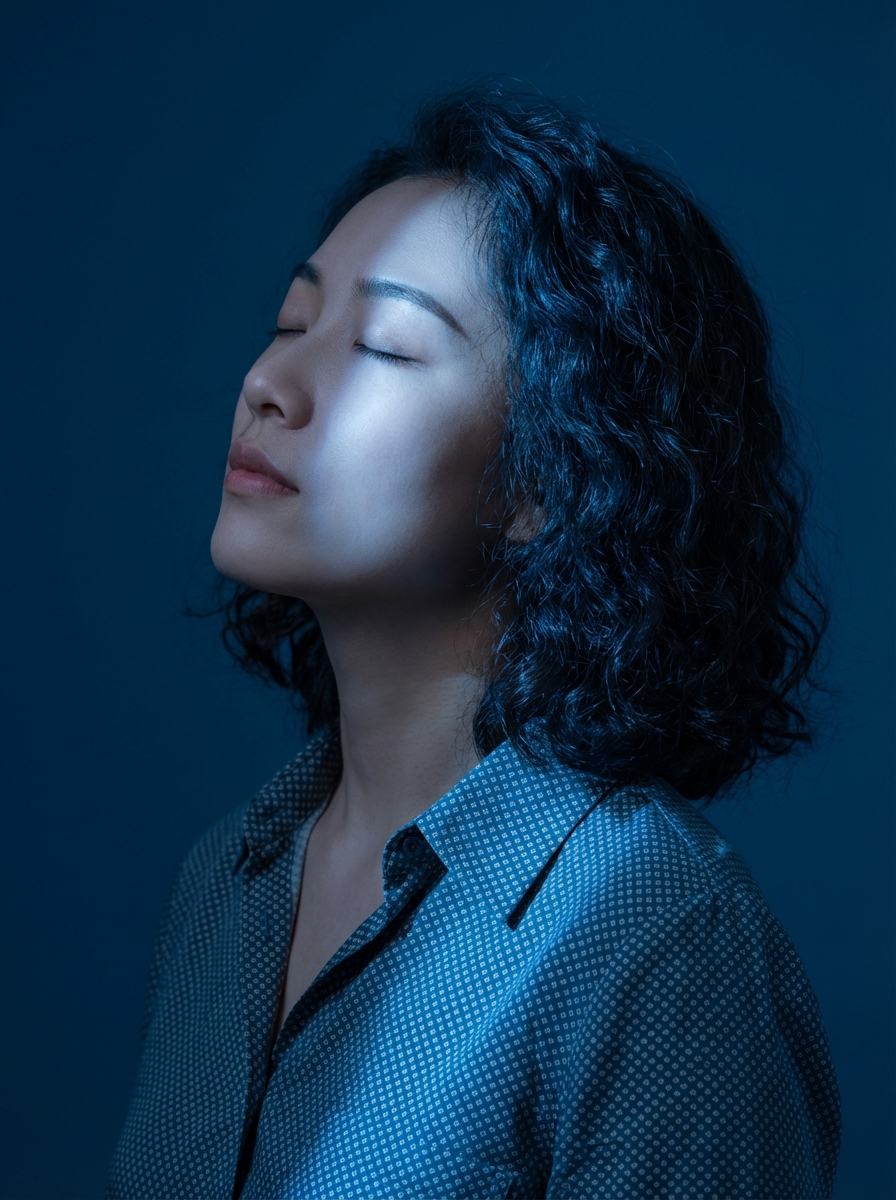 {"type": "image_generation_prompt", "concept": {"description": "An artistic editorial close-profile portrait of a young model, immersed in dramatic blue lighting. Her eyes are closed, with her head gently tilted upward, expressing serenity and introspection.", "mood": "quiet, introspective, ethereal", "color_theme": "deep blue with cold highlights"}, "subject": {"gender": "model", "identity_preservation": {"use_reference_image": true, "alter_face": false, "notes": "Maintain the subject’s exact facial features, structure, skin tone, and identity from the uploaded image."}, "pose": {"name": "Blue Profile", "head_position": "slightly tilted upward", "eyes": "closed", "expression": "serene and introspective", "highlight": "diagonal beam of light crossing the face, enhancing facial contours"}, "appearance": {"hair": {"style": "curly, voluminous, well-defined", "lighting_effect": "subtle blue reflections"}, "clothing": {"shirt": "petroleum-blue shirt with light gray micro-geometric print", "fabric": "lightweight material with soft shine under direct light", "collar": "traditional, top button open to reveal part of the neck", "details": {"cuffs": "adjusted cuffs", "stitching": "visible dark blue stitching", "fit": "elegant and modern"}}, "accessories": "none visible"}}, "camera_settings": {"camera": "Canon EOS R5", "lens": "85mm f/1.4", "aperture": "f/2.2", "iso": 320, "shutter_speed": "1/200s", "framing": "close-up profile, vertical 4:5 format", "resolution": "Ultra-HD 8K", "focus": "absolute focus on the face, capturing skin texture, hair, and light transitions"}, "lighting": {"type": "dramatic cold diagonal beam", "background": "deep solid blue", "effects": ["precise illumination on eyes, nose, and mouth", "soft enhancement of facial contours", "editorial contrast and silence-like aesthetic"]}, "visual_style": {"genre": "artistic editorial portrait", "contrast_level": "medium-high", "tone": "cold, atmospheric", "keywords": ["cinematic", "high-fashion", "introspective", "ethereal"]}, "output_goal": "Create an ultra-realistic editorial portrait of a young model in dramatic blue lighting, preserving her identity while capturing a serene, introspective moment in close-profile composition."}