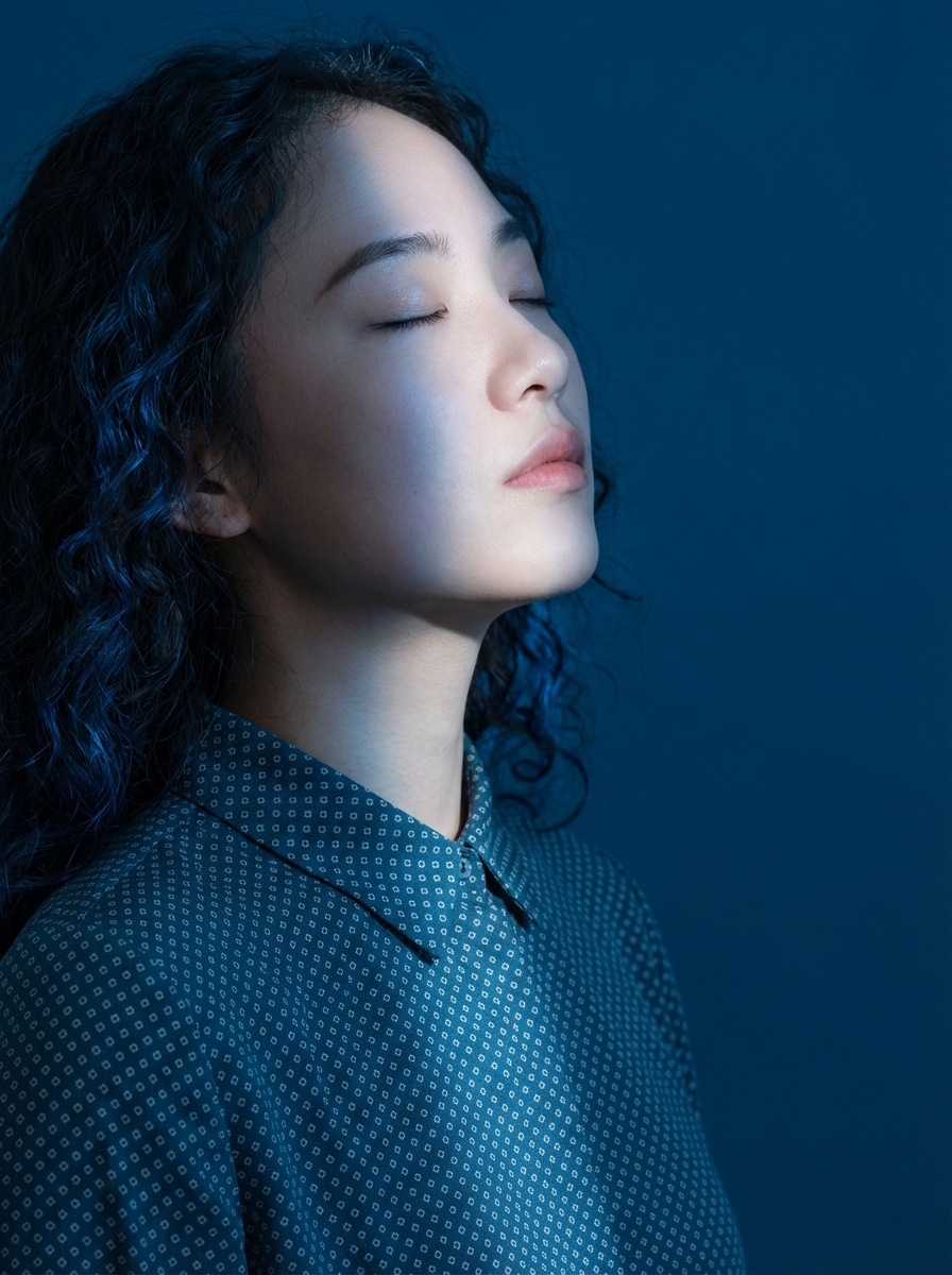 {"type": "image_generation_prompt", "concept": {"description": "An artistic editorial close-profile portrait of a young model, immersed in dramatic blue lighting. Her eyes are closed, with her head gently tilted upward, expressing serenity and introspection. A diagonal beam of cold light crosses her face, illuminating her eyes, nose, and lips with precise intensity. A solid deep blue background enhances the ethereal, emotional aesthetic.", "mood": "quiet, introspective, ethereal", "color_theme": "deep blue with cold highlights"}, "subject": {"gender": "model", "identity_preservation": {"use_reference_image": true, "alter_face": false, "notes": "Maintain the subject’s exact facial features, structure, skin tone, and identity from the uploaded image."}, "pose": {"name": "Blue Profile", "head_position": "slightly tilted upward", "eyes": "closed", "expression": "serene and introspective", "highlight": "diagonal beam of light crossing the face, enhancing facial contours"}, "appearance": {"hair": {"style": "curly, voluminous, well-defined", "lighting_effect": "subtle blue reflections"}, "clothing": {"shirt": "petroleum-blue shirt with light gray micro-geometric print", "fabric": "lightweight material with soft shine under direct light", "collar": "traditional, top button open to reveal part of the neck", "details": {"cuffs": "adjusted cuffs", "stitching": "visible dark blue stitching", "fit": "elegant and modern"}}, "accessories": "none visible"}}, "camera_settings": {"camera": "Canon EOS R5", "lens": "85mm f/1.4", "aperture": "f/2.2", "iso": 320, "shutter_speed": "1/200s", "framing": "close-up profile, vertical 4:5 format", "resolution": "Ultra-HD 8K", "focus": "absolute focus on the face, capturing skin texture, hair, and light transitions"}, "lighting": {"type": "dramatic cold diagonal beam", "background": "deep solid blue", "effects": ["precise illumination on eyes, nose, and mouth", "soft enhancement of facial contours", "editorial contrast and silence-like aesthetic"]}, "visual_style": {"genre": "artistic editorial portrait", "contrast_level": "medium-high", "tone": "cold, atmospheric", "keywords": ["cinematic", "high-fashion", "introspective", "ethereal"]}, "output_goal": "Create an ultra-realistic editorial portrait of a young model in dramatic blue lighting, preserving her identity while capturing a serene, introspective moment in close-profile composition."}