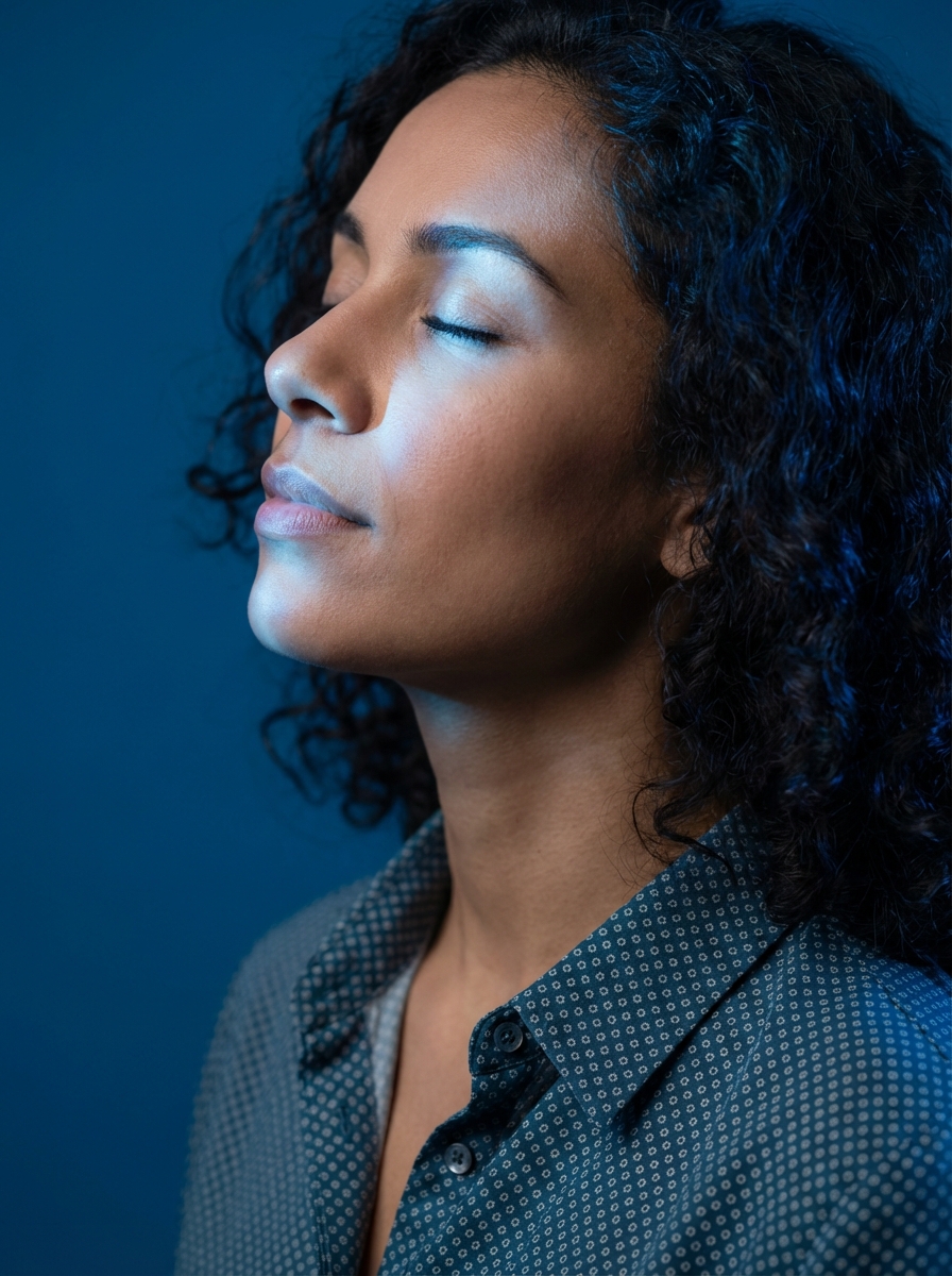 {"type": "image_generation_prompt", "concept": {"description": "An artistic editorial close-profile portrait of a young model, immersed in dramatic blue lighting. Her eyes are closed, with her head gently tilted upward, expressing serenity and introspection. A diagonal beam of cold light crosses her face, illuminating her eyes, nose, and lips with precise intensity. A solid deep blue background enhances the ethereal, emotional aesthetic.", "mood": "quiet, introspective, ethereal", "color_theme": "deep blue with cold highlights"}, "subject": {"gender": "model", "identity_preservation": {"use_reference_image": true, "alter_face": false, "notes": "Maintain the subject’s exact facial features, structure, skin tone, and identity from the uploaded image."}, "pose": {"name": "Blue Profile", "head_position": "slightly tilted upward", "eyes": "closed", "expression": "serene and introspective", "highlight": "diagonal beam of light crossing the face, enhancing facial contours"}, "appearance": {"hair": {"style": "curly, voluminous, well-defined", "lighting_effect": "subtle blue reflections"}, "clothing": {"shirt": "petroleum-blue shirt with light gray micro-geometric print", "fabric": "lightweight material with soft shine under direct light", "collar": "traditional, top button open to reveal part of the neck", "details": {"cuffs": "adjusted cuffs", "stitching": "visible dark blue stitching", "fit": "elegant and modern"}}, "accessories": "none visible"}}, "camera_settings": {"camera": "Canon EOS R5", "lens": "85mm f/1.4", "aperture": "f/2.2", "iso": 320, "shutter_speed": "1/200s", "framing": "close-up profile, vertical 4:5 format", "resolution": "Ultra-HD 8K", "focus": "absolute focus on the face, capturing skin texture, hair, and light transitions"}, "lighting": {"type": "dramatic cold diagonal beam", "background": "deep solid blue", "effects": ["precise illumination on eyes, nose, and mouth", "soft enhancement of facial contours", "editorial contrast and silence-like aesthetic"]}, "visual_style": {"genre": "artistic editorial portrait", "contrast_level": "medium-high", "tone": "cold, atmospheric", "keywords": ["cinematic", "high-fashion", "introspective", "ethereal"]}, "output_goal": "Create an ultra-realistic editorial portrait of a young model in dramatic blue lighting, preserving her identity while capturing a serene, introspective moment in close-profile composition."}