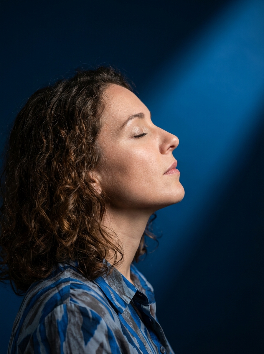 {"type": "image_generation_prompt", "concept": {"description": "An artistic editorial close-profile portrait of a young model, immersed in dramatic blue lighting. Her eyes are closed, with her head gently tilted upward, expressing serenity and introspection.", "mood": "quiet, introspective, ethereal", "color_theme": "deep blue with cold highlights"}, "subject": {"gender": "model", "identity_preservation": {"use_reference_image": true, "alter_face": false, "notes": "Maintain the subject’s exact facial features, structure, skin tone, and identity from the uploaded image."}, "pose": {"name": "Blue Profile", "head_position": "slightly tilted upward", "eyes": "closed", "expression": "serene and introspective", "highlight": "diagonal beam of light crossing the face, enhancing facial contours"}, "appearance": {"hair": {"style": "curly, voluminous, well-defined", "lighting_effect": "subtle blue reflections"}, "clothing": {"shirt": "petroleum-blue shirt with light gray micro-geometric print", "fabric": "lightweight material with soft shine under direct light", "collar": "traditional, top button open to reveal part of the neck", "details": {"cuffs": "adjusted cuffs", "stitching": "visible dark blue stitching", "fit": "elegant and modern"}}, "accessories": "none visible"}}, "camera_settings": {"camera": "Canon EOS R5", "lens": "85mm f/1.4", "aperture": "f/2.2", "iso": 320, "shutter_speed": "1/200s", "framing": "close-up profile, vertical 4:5 format", "resolution": "Ultra-HD 8K", "focus": "absolute focus on the face, capturing skin texture, hair, and light transitions"}, "lighting": {"type": "dramatic cold diagonal beam", "background": "deep solid blue", "effects": ["precise illumination on eyes, nose, and mouth", "soft enhancement of facial contours", "editorial contrast and silence-like aesthetic"]}, "visual_style": {"genre": "artistic editorial portrait", "contrast_level": "medium-high", "tone": "cold, atmospheric", "keywords": ["cinematic", "high-fashion", "introspective", "ethereal"]}, "output_goal": "Create an ultra-realistic editorial portrait of a young model in dramatic blue lighting, preserving her identity while capturing a serene, introspective moment in close-profile composition."}