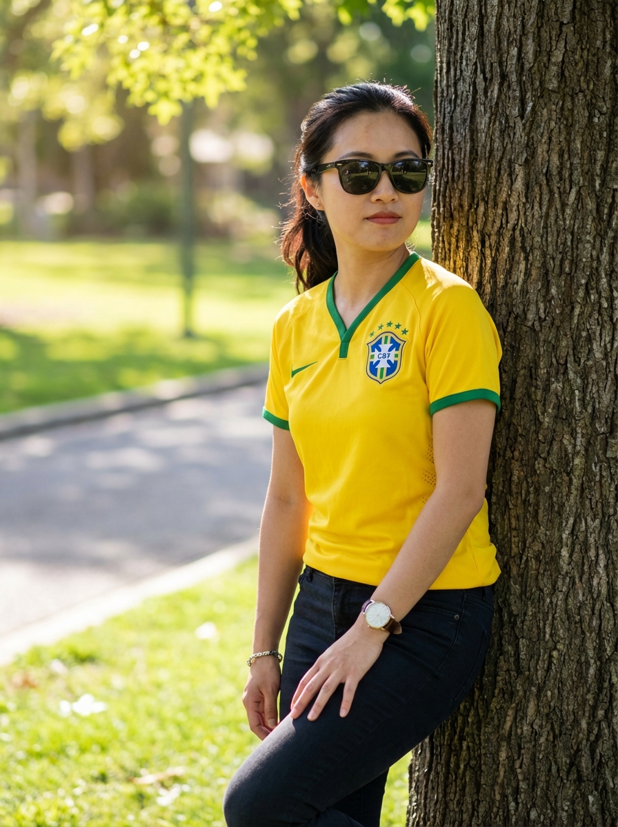 {"type": "image_generation_prompt", "style": "casual, stylish, outdoor portrait, photorealistic", "identity_preservation": {"use_reference_image": true, "alter_face": false, "notes": "Preserve the model’s face, hairstyle, skin tone, and body proportions exactly as shown in the reference image. Do not change facial features."}, "subject": {"gender": "model", "pose": {"stance": "standing and leaning casually against a tree trunk", "body_orientation": "slightly turned to the side", "gaze": "looking to the side through sunglasses", "expression": "confident and relaxed", "hand_position": "one hand resting naturally on her thigh"}, "wardrobe": {"top": "Brazilian national soccer team jersey", "bottoms": "pants", "accessories": ["dark sunglasses", "wristwatch with dark band", "simple metal bracelet"]}}, "environment": {"location": "outdoor park or green area", "ground": ["grass", "paved walking path"], "background": {"style": "softly blurred (bokeh)", "lighting": "bright natural sunlight"}}, "lighting": {"type": "natural daylight", "quality": "bright and direct", "effects": ["defined highlights", "natural shadows enhancing body shape"]}, "camera": {"camera_type": "full-frame", "lens": "85mm f/1.8 or 50mm f/1.4", "aperture": "f/2.8 – f/4.0", "iso": 100, "shutter_speed": "1/500s – 1/1000s", "depth_of_field": "creamy bokeh with subject isolation", "framing": "medium-length portrait"}, "mood": {"atmosphere": "relaxed, confident, sunny", "style": "modern lifestyle photography"}, "quality": {"realism": "highly photorealistic", "detail_level": "sharp subject with natural textures"}, "output_goal": "Create a realistic outdoor lifestyle portrait of a model in a park, leaning against a tree while wearing a Brazilian national soccer team jersey, preserving her exact identity and delivering a confident, casual, and sunlit aesthetic."}