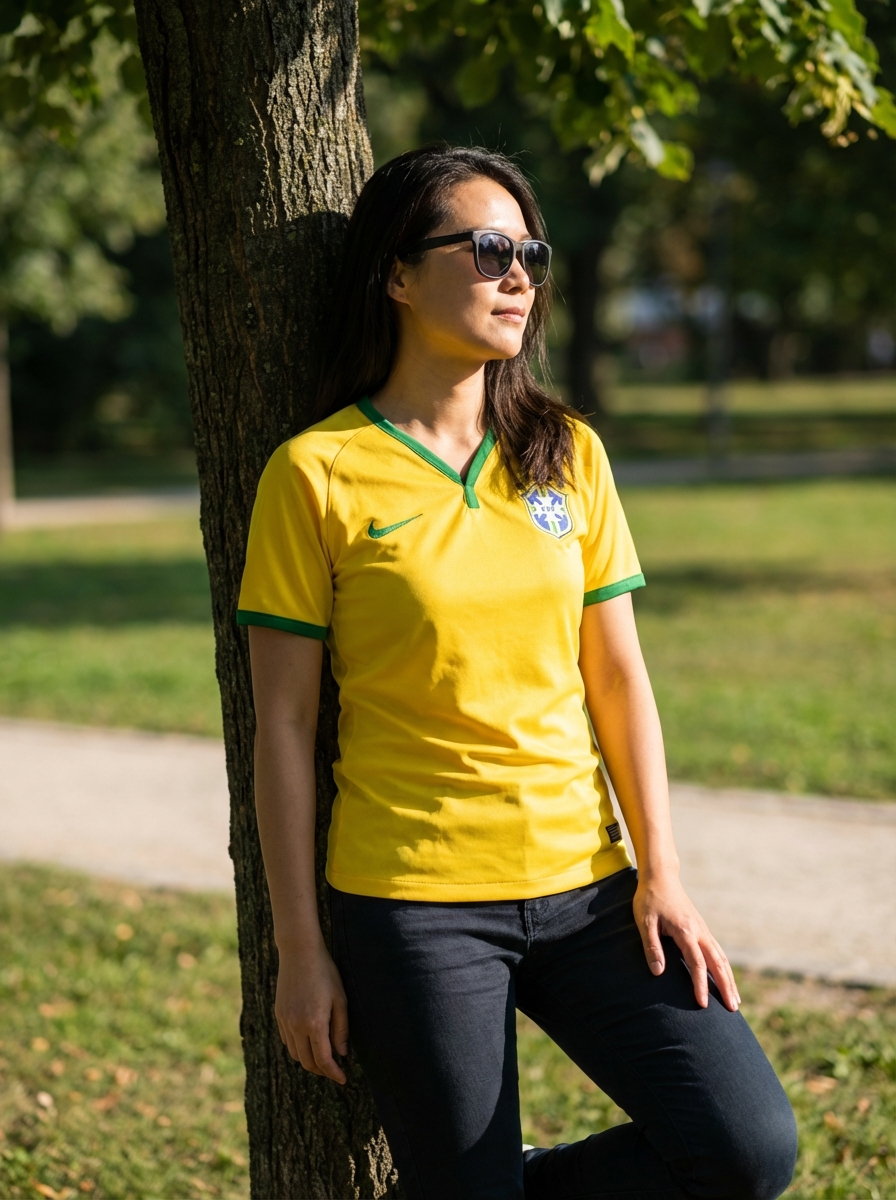 {"type": "image_generation_prompt", "style": "casual, stylish, outdoor portrait, photorealistic", "identity_preservation": {"use_reference_image": true, "alter_face": false, "notes": "Preserve the model’s face, hairstyle, skin tone, and body proportions exactly as shown in the reference image. Do not change facial features."}, "subject": {"gender": "model", "pose": {"stance": "standing and leaning casually against a tree trunk", "body_orientation": "slightly turned to the side", "gaze": "looking to the side through sunglasses", "expression": "confident and relaxed", "hand_position": "one hand resting naturally on her thigh"}, "wardrobe": {"top": "Brazilian national soccer team jersey", "bottoms": "pants", "accessories": ["dark sunglasses", "wristwatch with dark band", "simple metal bracelet"]}}, "environment": {"location": "outdoor park or green area", "ground": ["grass", "paved walking path"], "background": {"style": "softly blurred (bokeh)", "lighting": "bright natural sunlight"}}, "lighting": {"type": "natural daylight", "quality": "bright and direct", "effects": ["defined highlights", "natural shadows enhancing body shape"]}, "camera": {"camera_type": "full-frame", "lens": "85mm f/1.8 or 50mm f/1.4", "aperture": "f/2.8 – f/4.0", "iso": 100, "shutter_speed": "1/500s – 1/1000s", "depth_of_field": "creamy bokeh with subject isolation", "framing": "medium-length portrait"}, "mood": {"atmosphere": "relaxed, confident, sunny", "style": "modern lifestyle photography"}, "quality": {"realism": "highly photorealistic", "detail_level": "sharp subject with natural textures"}, "output_goal": "Create a realistic outdoor lifestyle portrait of a model in a park, leaning against a tree while wearing a Brazilian national soccer team jersey, preserving her exact identity and delivering a confident, casual, and sunlit aesthetic."}