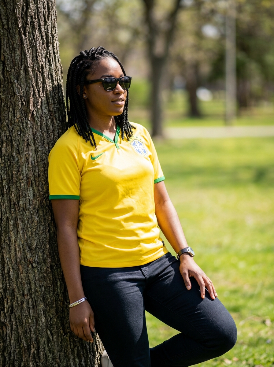 {"type": "image_generation_prompt", "style": "casual, stylish, outdoor portrait, photorealistic", "identity_preservation": {"use_reference_image": true, "alter_face": false, "notes": "Preserve the model’s face, hairstyle, skin tone, and body proportions exactly as shown in the reference image. Do not change facial features."}, "subject": {"gender": "model", "pose": {"stance": "standing and leaning casually against a tree trunk", "body_orientation": "slightly turned to the side", "gaze": "looking to the side through sunglasses", "expression": "confident and relaxed", "hand_position": "one hand resting naturally on her thigh"}, "wardrobe": {"top": "Brazilian national soccer team jersey", "bottoms": "pants", "accessories": ["dark sunglasses", "wristwatch with dark band", "simple metal bracelet"]}}, "environment": {"location": "outdoor park or green area", "ground": ["grass", "paved walking path"], "background": {"style": "softly blurred (bokeh)", "lighting": "bright natural sunlight"}}, "lighting": {"type": "natural daylight", "quality": "bright and direct", "effects": ["defined highlights", "natural shadows enhancing body shape"]}, "camera": {"camera_type": "full-frame", "lens": "85mm f/1.8 or 50mm f/1.4", "aperture": "f/2.8 – f/4.0", "iso": 100, "shutter_speed": "1/500s – 1/1000s", "depth_of_field": "creamy bokeh with subject isolation", "framing": "medium-length portrait"}, "mood": {"atmosphere": "relaxed, confident, sunny", "style": "modern lifestyle photography"}, "quality": {"realism": "highly photorealistic", "detail_level": "sharp subject with natural textures"}, "output_goal": "Create a realistic outdoor lifestyle portrait of a model in a park, leaning against a tree while wearing a Brazilian national soccer team jersey, preserving her exact identity and delivering a confident, casual, and sunlit aesthetic."}