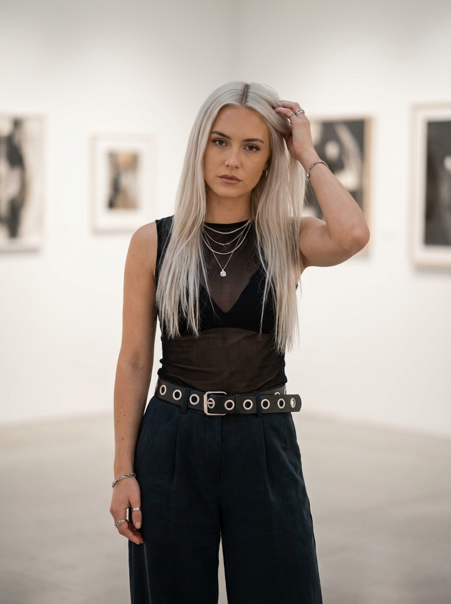 {"type": "image_generation", "woman_style": "ultra_photorealistic", "aspect_ratio": "3:4", "resolution": "8K", "quality": "extreme_detail_realism", "identity_reference": {"use_reference_image": true, "face_preservation": "exact", "body_preservation": "exact", "no_facial_changes": true, "no_body_modification": true}, "subject": {"gender": "model", "age": "young adult", "expression": "calm, confident gaze, slightly serious", "pose": "standing naturally, one hand touching hair, relaxed posture", "hair": {"style": "long straight hair ", "color": "Platunum with platinum blonde front highlights", "part": "center part"}, "face_details": {"skin_texture": "natural skin with visible pores", "makeup": "soft glam makeup, winged eyeliner , neutral lips", "features": "sharp eyes, subtle contour, realistic facial proportions"}}, "outfit": {"top": "sheer sleeveless top with thin straps", "bottom": "skirt or pants with wide grommet belt", "accessories": ["layered necklaces", "rings on fingers", "bracelet on wrist", "small nose ring"]}, "lighting": {"type": "soft indoor studio lighting", "direction": "front-left diffused light", "effect": "smooth highlights, natural shadows, realistic depth"}, "background": {"environment": "modern art gallery or minimalist indoor space", "depth_of_field": "shallow, blurred background", "color_tone": "neutral grey and white"}, "camera": {"device": "full-frame mirrorless camera", "lens": "50mm prime", "aperture": "f/1.8", "focus": "sharp focus on subject", "style": "fashion editorial photography"}, "negative_prompt": ["cartoon", "anime", "illustration", "over-smooth skin", "plastic face", "extra fingers", "deformed hands", "blurred face", "low resolution", "watermark", "text", "AI artifacts"]}