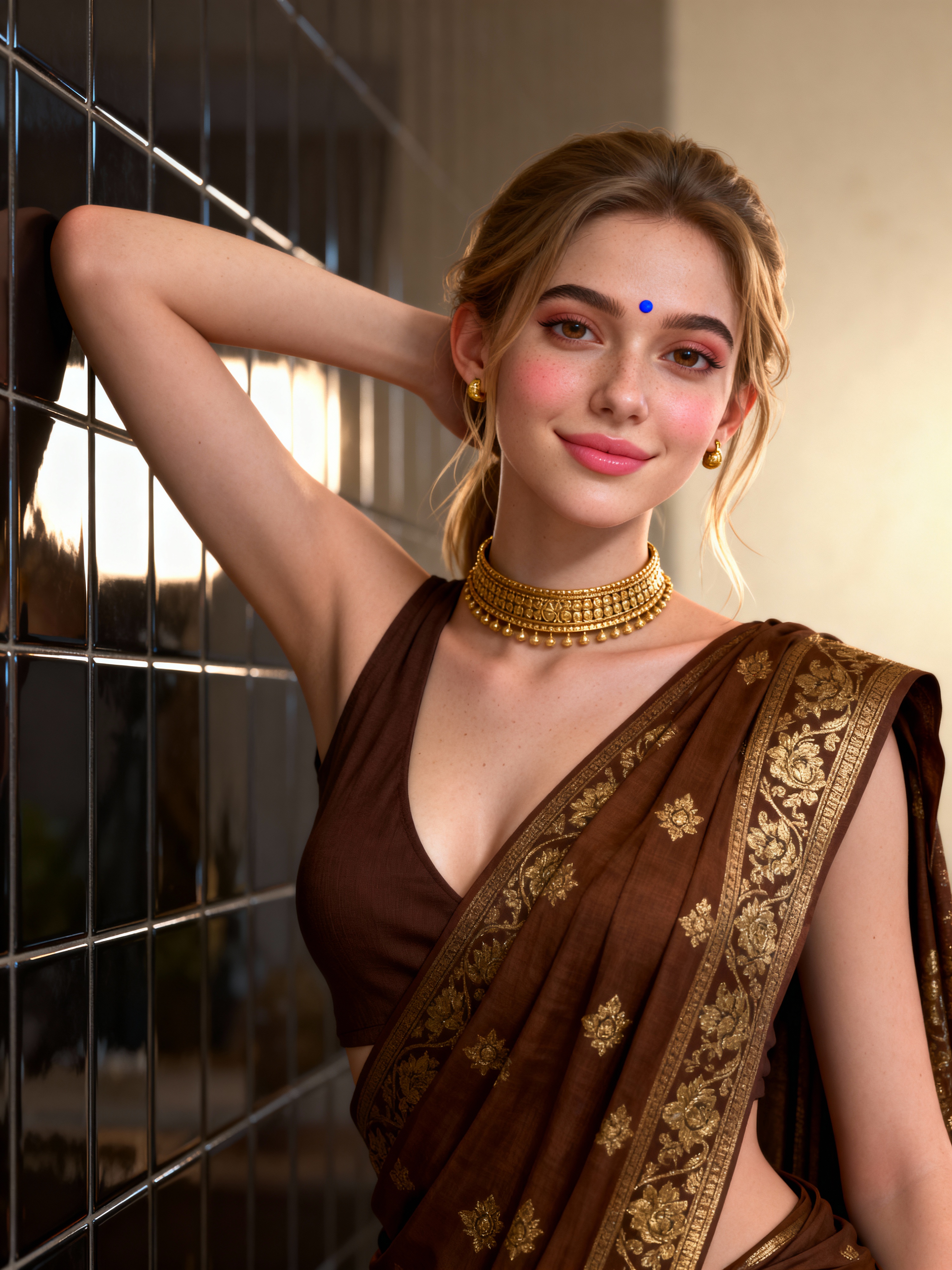 {"type": "image_generation", "woman_style": "ultra_photorealistic", "aspect_ratio": "9:16", "resolution": "8K", "quality": "editorial_fashion_realism", "identity_reference": {"use_reference_image": true, "face_preservation": "100%", "body_preservation": "100%", "no_facial_changes": true, "no_body_changes": true}, "scene": {"location": "indoor setting with dark glossy tiled wall", "background": "reflective tiles with soft depth", "atmosphere": "intimate, elegant, traditional-modern fusion"}, "subject": {"gender": "model", "age": "young adult", "pose": "upper-body portrait, one arm raised and resting against wall, relaxed confident posture", "expression": "soft calm smile, natural and composed", "gaze": "looking directly at camera", "hair": {hair, "style": "half-tied with loose front strands", "texture": "natural, realistic flyaways"}, "skin": {"tone": "fair warm complexion", "detail": "visible pores, natural blush , no smoothing"}, if(gender=f){"makeup": {"style": "soft traditional glam", "details": ["natural brows", "soft brown eye makeup", "subtle eyeliner} ", "rosy nude lips ", "small blue bindi on forehead"]}}, "outfit": {"style": "traditional saree look", "blouse ": "deep brown sleeveless blouse with plunging neckline", "saree": "brown saree with gold embroidered patterns", "fabric_behavior": "realistic drape, natural folds and weight"}, "accessories": ["heavy gold choker necklace", "small gold earrings "], "lighting": {"type": "soft directional indoor lighting", "source": "side-front light", "effect": "gentle highlights on face, soft shadows, cinematic depth"}, "camera": {"device": "professional portrait camera", "lens": "85mm portrait lens", "angle": "eye-level close portrait", "focus": "sharp eyes and face", "depth_of_field": "shallow, creamy background blur"}, "rendering_rules": {"no_cartoon": true, "no_ai_artifacts": true, "no_over_smoothing": true, "no_extra_limbs": true, "no_distorted_hands": true, "no_text_or_watermark": true}, "final_look": "indistinguishable from a real high-end fashion portrait, ultra-realistic, same pose and mood"}
