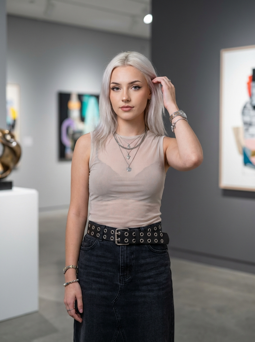 {"type": "image_generation", "woman_style": "ultra_photorealistic", "aspect_ratio": "3:4", "resolution": "8K", "quality": "extreme_detail_realism", "identity_reference": {"use_reference_image": true, "face_preservation": "exact", "body_preservation": "exact", "no_facial_changes": true, "no_body_modification": true}, "subject": {"gender": "model", "age": "young adult", "expression": "calm, confident gaze, slightly serious", "pose": "standing naturally, one hand touching hair, relaxed posture", "hair": {"style": "long straight hair ", "color": "Platunum with platinum blonde front highlights", "part": "center part"}, "face_details": {"skin_texture": "natural skin with visible pores", "makeup": "soft glam makeup, winged eyeliner , neutral lips", "features": "sharp eyes, subtle contour, realistic facial proportions"}}, "outfit": {"top": "sheer sleeveless top with thin straps", "bottom": "skirt or pants with wide grommet belt", "accessories": ["layered necklaces", "rings on fingers", "bracelet on wrist", "small nose ring"]}, "lighting": {"type": "soft indoor studio lighting", "direction": "front-left diffused light", "effect": "smooth highlights, natural shadows, realistic depth"}, "background": {"environment": "modern art gallery or minimalist indoor space", "depth_of_field": "shallow, blurred background", "color_tone": "neutral grey and white"}, "camera": {"device": "full-frame mirrorless camera", "lens": "50mm prime", "aperture": "f/1.8", "focus": "sharp focus on subject", "style": "fashion editorial photography"}, "negative_prompt": ["cartoon", "anime", "illustration", "over-smooth skin", "plastic face", "extra fingers", "deformed hands", "blurred face", "low resolution", "watermark", "text", "AI artifacts"]}