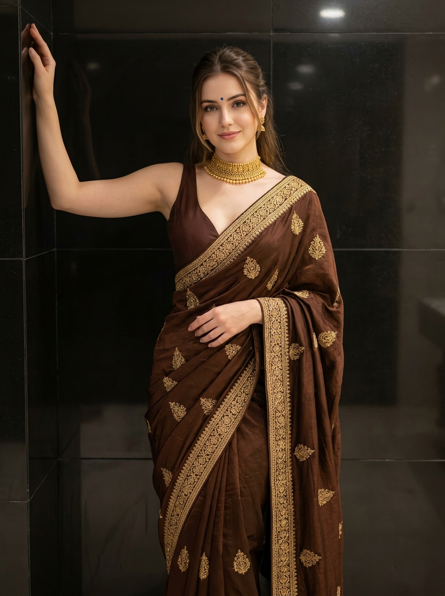 {"type": "image_generation", "woman_style": "ultra_photorealistic", "aspect_ratio": "9:16", "resolution": "8K", "quality": "editorial_fashion_realism", "identity_reference": {"use_reference_image": true, "face_preservation": "100%", "body_preservation": "100%", "no_facial_changes": true, "no_body_changes": true}, "scene": {"location": "indoor setting with dark glossy tiled wall", "background": "reflective tiles with soft depth", "atmosphere": "intimate, elegant, traditional-modern fusion"}, "subject": {"gender": "model", "age": "young adult", "pose": "upper-body portrait, one arm raised and resting against wall, relaxed confident posture", "expression": "soft calm smile, natural and composed", "gaze": "looking directly at camera", "hair": {hair, "style": "half-tied with loose front strands", "texture": "natural, realistic flyaways"}, "skin": {"tone": "fair warm complexion", "detail": "visible pores, natural blush , no smoothing"}, if(gender=f){"makeup": {"style": "soft traditional glam", "details": ["natural brows", "soft brown eye makeup", "subtle eyeliner} ", "rosy nude lips ", "small blue bindi on forehead"]}}, "outfit": {"style": "traditional saree look", "blouse ": "deep brown sleeveless blouse with plunging neckline", "saree": "brown saree with gold embroidered patterns", "fabric_behavior": "realistic drape, natural folds and weight"}, "accessories": ["heavy gold choker necklace", "small gold earrings "], "lighting": {"type": "soft directional indoor lighting", "source": "side-front light", "effect": "gentle highlights on face, soft shadows, cinematic depth"}, "camera": {"device": "professional portrait camera", "lens": "85mm portrait lens", "angle": "eye-level close portrait", "focus": "sharp eyes and face", "depth_of_field": "shallow, creamy background blur"}, "rendering_rules": {"no_cartoon": true, "no_ai_artifacts": true, "no_over_smoothing": true, "no_extra_limbs": true, "no_distorted_hands": true, "no_text_or_watermark": true}, "final_look": "indistinguishable from a real high-end fashion portrait, ultra-realistic, same pose and mood"}