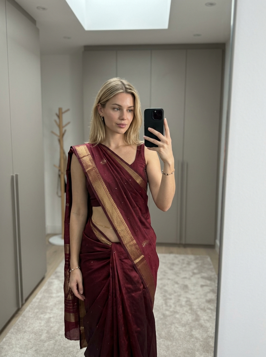 {"type": "image_generation", "woman_style": "ultra_photorealistic", "aspect_ratio": "9:16", "resolution": "8K", "quality": "high_detail_realism", "identity_reference": {"use_reference_image": true, "face_preservation": "exact", "body_preservation": "exact", "no_facial_changes": true, "no_body_modification": true}, "subject": {"gender": "model", "age": "young adult", "expression": "soft confident gaze, natural lips slightly parted", "pose": "slightly angled mirror selfie pose, relaxed shoulders, natural posture", "hair": {hair, "style": "loose, natural volume, middle part", "texture": "smooth and realistic"}, "skin": {"tone": "warm natural complexion", "detail": " skin texture, realistic highlights, no plastic look"}}, "outfit": {"style": "saree with modern blouse ", "blouse ": "sleeveless blouse with subtle shimmer embroidery", "saree": "draped saree with soft fabric folds and realistic fabric physics", "accessories": ["delicate waist chain", "minimal jewelry"]}, "environment": {"location": "indoor modern bedroom or dressing area", "background": "clean wardrobe cabinets", "lighting": {"type": "soft indoor lighting", "source": "overhead ceiling light", "effect": "natural shadows, balanced highlights"}}, "camera": {"device": "smartphone", "lens": "natural portrait lens", "angle": "slightly above eye level", "focus": "sharp focus on subject, mild background softness", "depth_of_field": "realistic"}, "rendering_rules": {"no_cartoon": true, "no_ai_artifacts": true, "no_over_smoothing": true, "no_extra_limbs": true, "no_distorted_hands": true, "no_text_or_watermark": true}, "final_look": "looks like a real candid photo, ultra-realistic, editorial yet natural"}